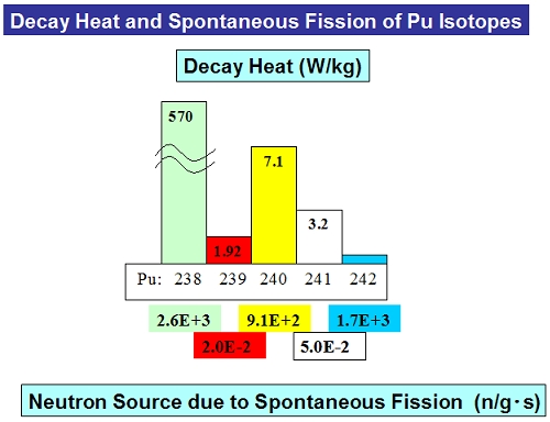 Why 238Pu is important for the denaturing of plutonium? This is because of his huge decay heat. Also the spontaneous fission of 238Pu produces a lot of neutrons.