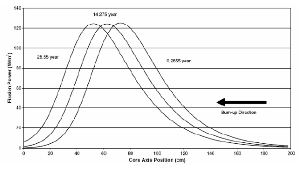 During the exploitation of the reactor, nucleus of the fissile materials in the burning zone will be consumed and in the fresh fuel zone, on the contrary - accumulated. That will cause slow burning zone shift in the axial direction, as it is shown on the Figure 1. After the exploitation of the first reactor burning zone of it can be used to load the second reactor.