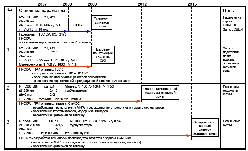Приводятся характеристики базового варианта конструкции и топливного цикла, а также целевые показатели, которые должны быть достигнуты в результате выполнения намеченных НИОКР.