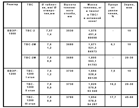 Конструкция ТВС-2М обеспечивает возможность максимального удлинения топливного столба (табл. 2). Она также более приспособлена к любым усовершенствованиям, применима для любых внедряемых или планируемых топливных циклов.