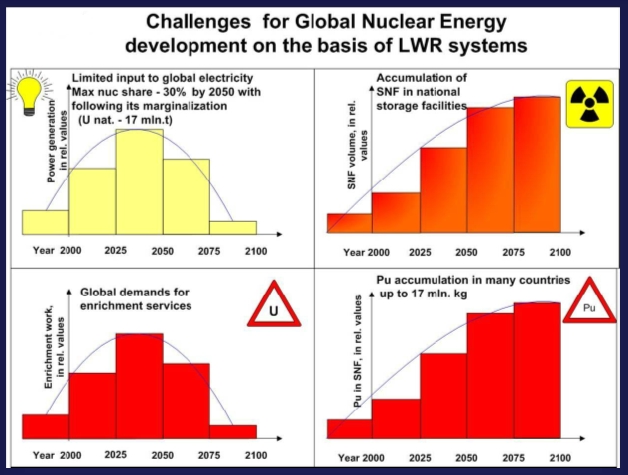 Если в мировой атомной энергетике не произойдёт качественных изменений, то все запасы доступного урана могут быть вовлечены в ЯТЦ в период 2030-2040 годов. Отрасль достигнет максимума в своём развитии, после чего встанет во всей остроте проблема поиска дополнительных ресурсов. Следует отметить, что, в отличие от обычной энергетики, атомная энергетика не сможет просто сойти на нет, так как она оставит после себя огромные запасы ОЯТ и плутония.