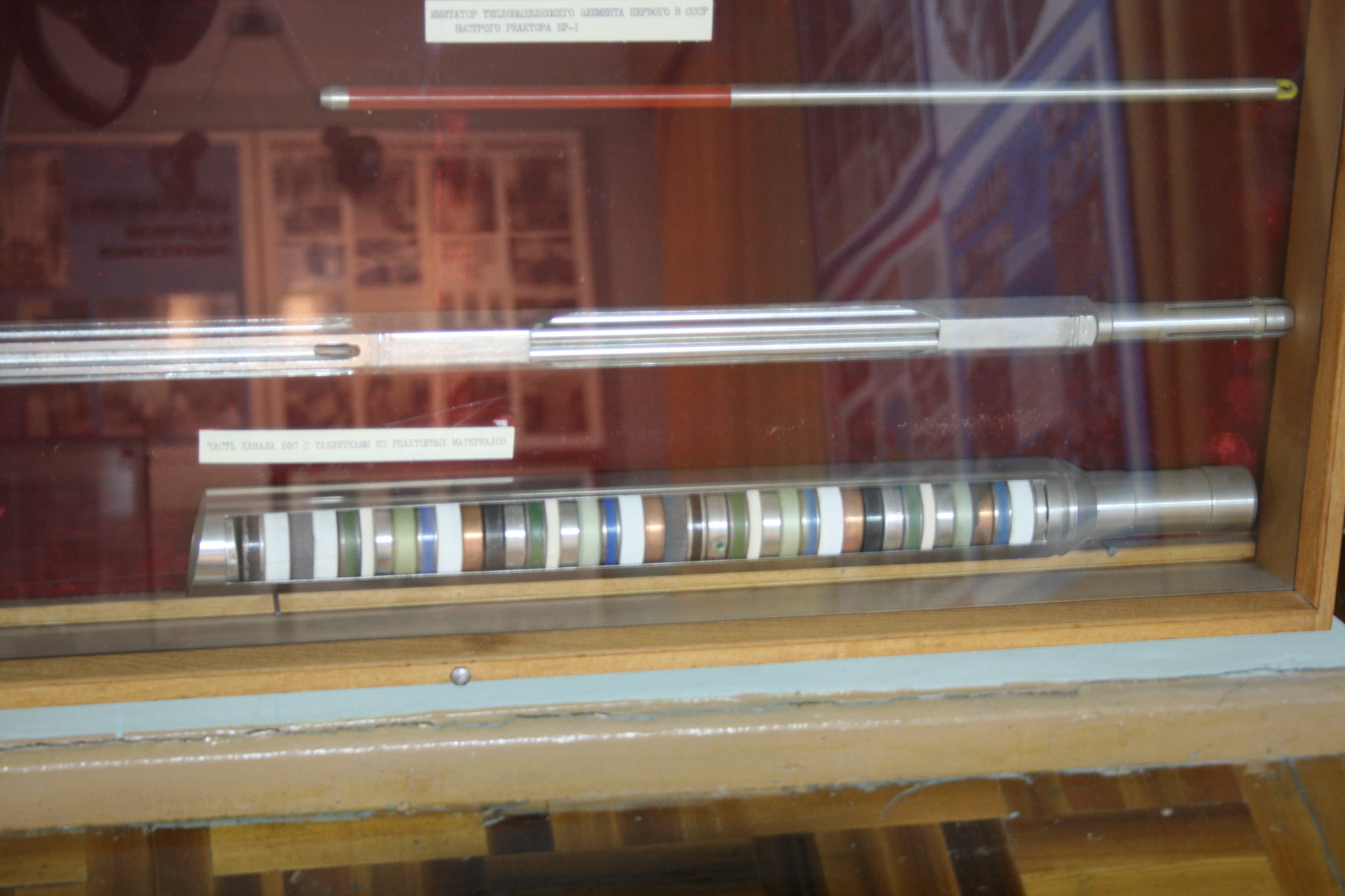 Вот потрясающие экспонаты, не пропустите. Вверху - имитатор тепловыделяющего элемента первого в СССР и в Европе быстрого реактора БР-1. Это - установка нулевой мощности, критсборка, на которой отрабатывались конструкции быстрых энергетических реакторов. А ниже расположена часть канала быстрого физического стенда (БФС) с таблетками из реакторных материалов. Подбирая разные таблетки и комбинируя их расположение, в БФС можно создавать различные типы спектров нейтронов.