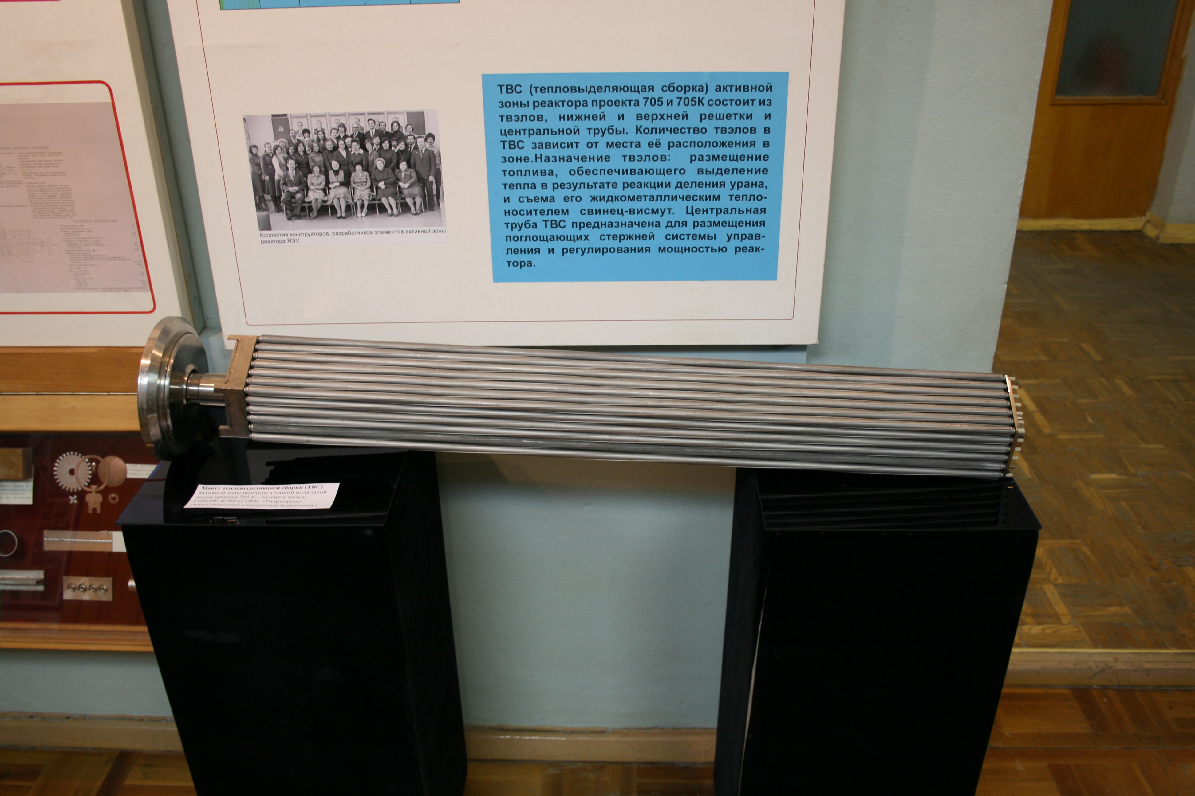 Эта часть экспозиции посвящена лодочным реакторам. Вы можете видеть подарок музею от ОКБ "Гидропресс" - макет ТВС реактора АПЛ проекта 705 К в натуральную величину. Количество твэлов в кассете зависит от места её расположения в активной зоне. В центральных трубах помещаются стержни системы управления и регулирования мощности. Теплоноситель в проектах 705 и 705К - жидкометаллический сплав свинец-висмут.