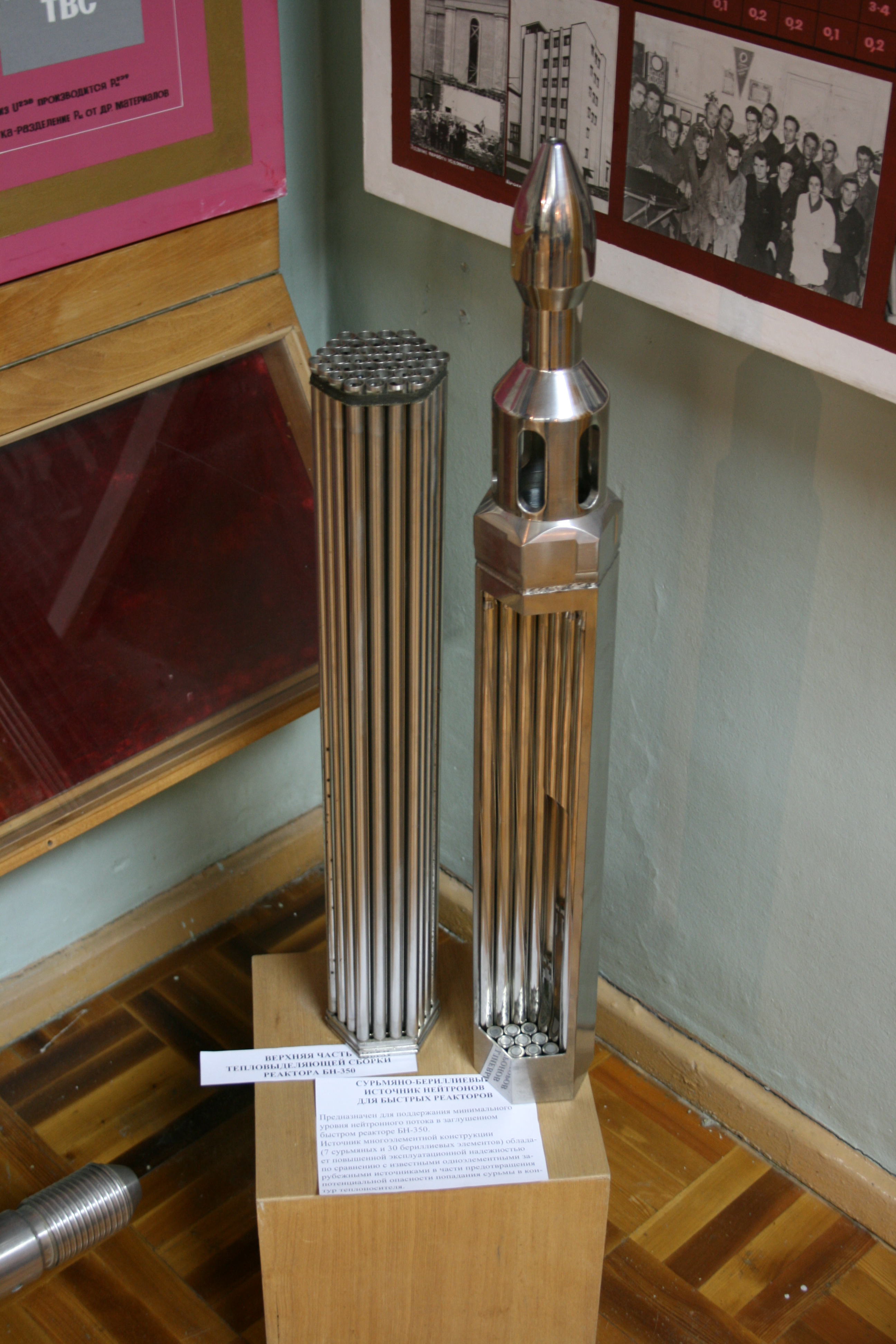 Слева находится верхняя часть ТВС реактора БН-350. Справа от неё стоит сурьмяно-бериллиевый источник нейтронов для быстрых реакторов. В городе Шевченко его использовали для того, чтобы поддерживать минимальный уровень нейтронного потока в заглушенном реакторе. Конструкция источника достаточно сложная, он состоит из 7 сурьмяных и 30 бериллиевых элементов. Зато это позволило повысить надёжность и избавиться от опасности попадания сурьмы в контур теплоносителя.