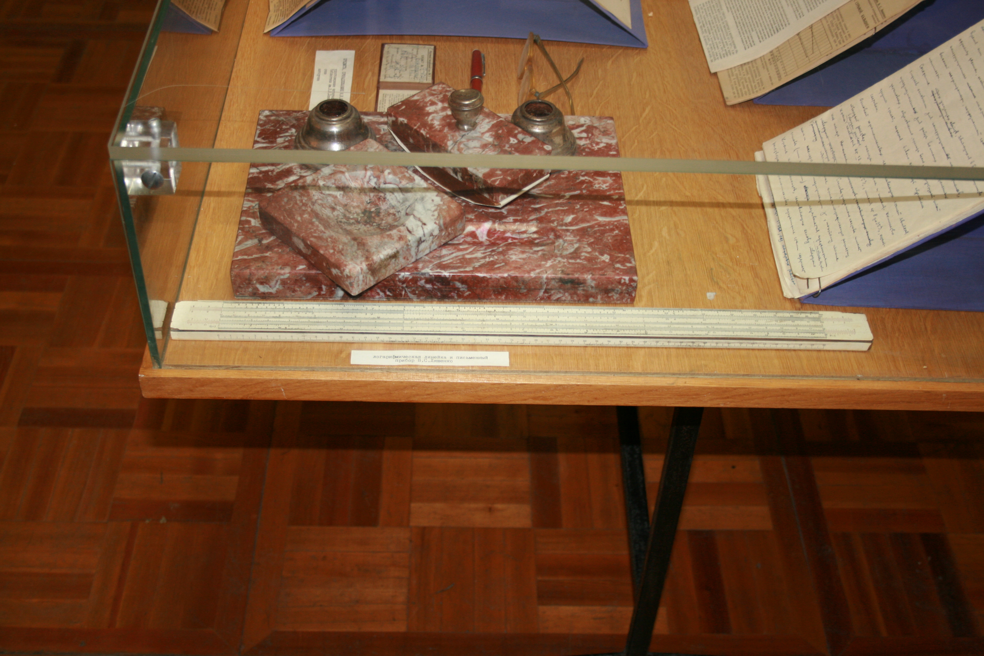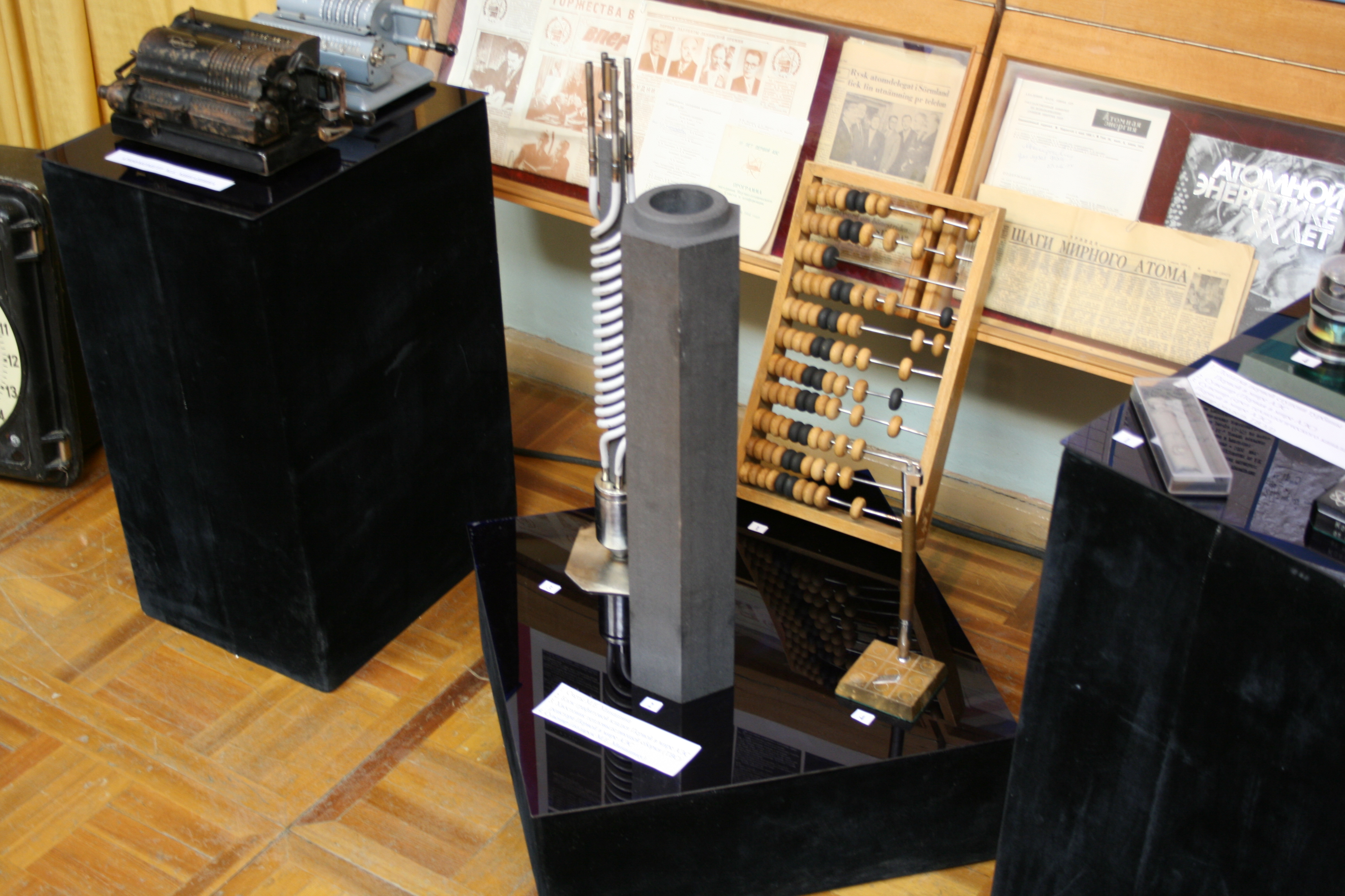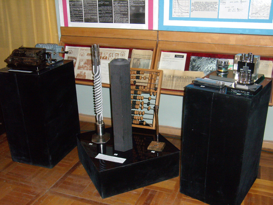 Посмотрите на уникальные экспонаты. Здесь вы видите блок графитовой кладки Первой АЭС, а прямо за ним - обыкновенные счёты, принадлежавшие Михаилу Егоровичу Минашину. А рядом, на другой витрине, логарифмическая линейка Василия Саввича Ляшенко. Именно на этих исторических счётах и логарифмических линейках производились физические и тепловые расчёты уран-графитового реактора АМ для Первой в мире атомной станции.
