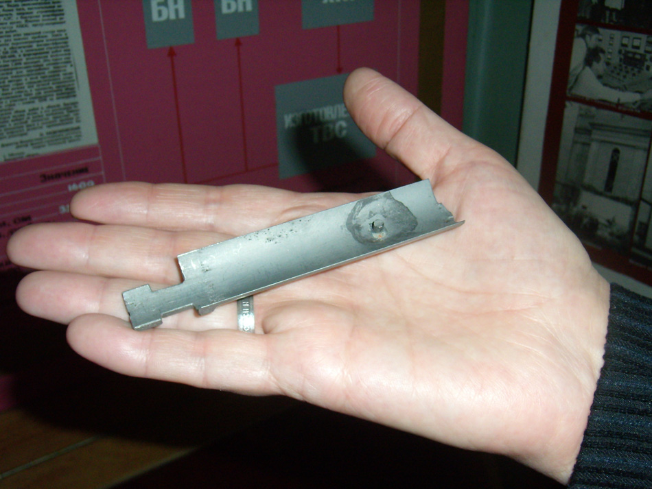 А здесь у нас хранится вещь, не менее уникальная - лопатка турбины Первой АЭС. Той самой знаменитой "Мани", сделанной еще в начале XX века германской фирмой MAN. Именно она впервые в мире стала вращаться паром, полученным от энергии атомного ядра. К сожалению, после того, как АМ было решено использовать как исследовательский реактор, турбина была демонтирована и по роковому стечению обстоятельств сдана в металлолом. Энтузиастам удалось спасти отдельные детали турбины, одна из которых теперь хранится в нашем музее.
