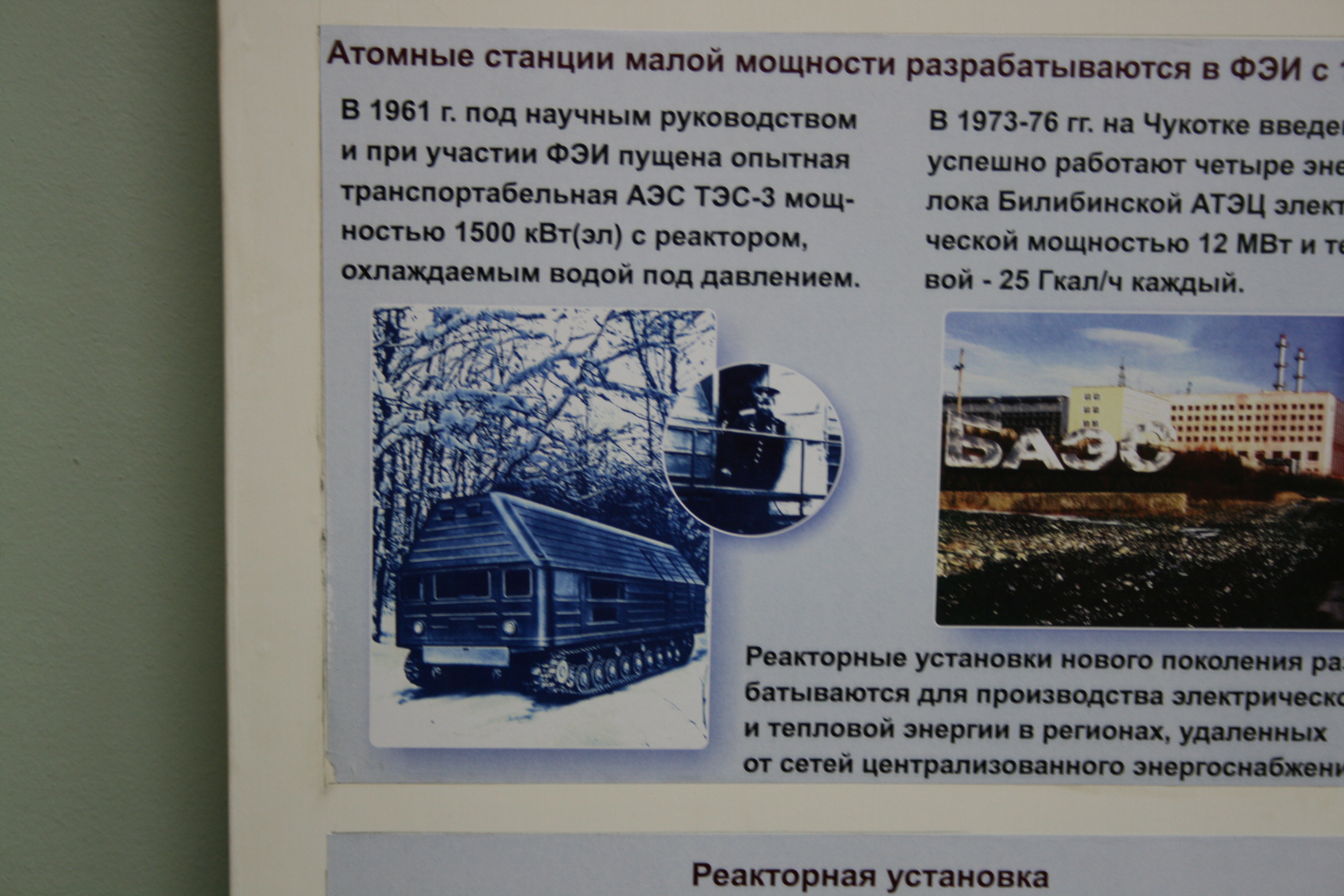 Следующий раздел нашей экспозиции - малая энергетика, несправедливо остающаяся в тени своих больших удачливых собратьев. На этом стенде вы можете видеть фотографию транспортабельной атомной электростанции ТЭС-3. Она стала первой установкой среди опытных и демонстрационных АЭС малой мощности, создававшихся для удалённых и малонаселённых районов страны.