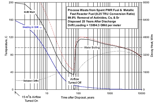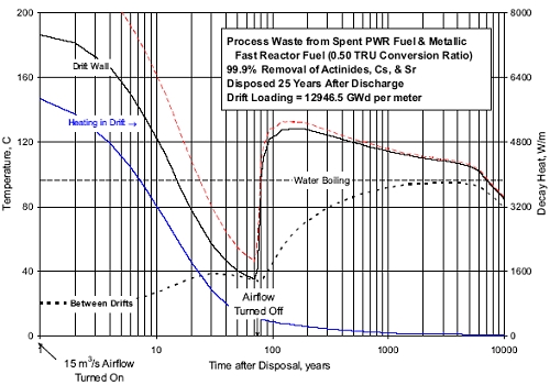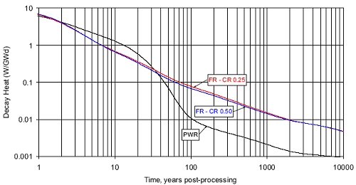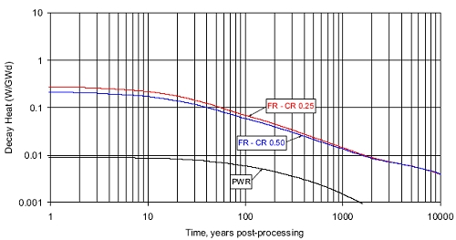Опираясь на достижимую по современным реалиям величину 99,9% очистки ОЯТ от актинидов, стронция и цезия, американские атомщики установили, что остаточное тепловыделение отходов от переработки ОЯТ быстрых реакторов будет на протяжении практически всего периода хранения выше, чем тепловыделение отходов от переработки ОЯТ тепловых реакторов. Обратная картина будет наблюдаться только в первые 30-35 лет. Виной тому станет повышенное содержание в ОЯТ быстрых реакторов трансурановых элементов.