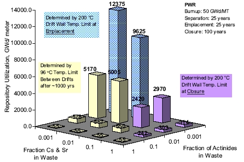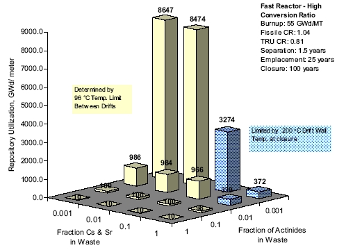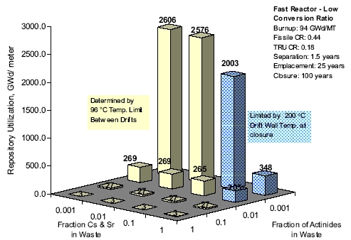 Однако, делая индивидуальные расчёты для тепловых и быстрых реакторов, нельзя забывать, что инициатива GNEP предполагает совместную работу реакторных установок двух типов. Следовательно, одновременному размещению в долгосрочном хранилище будут подлежать отходы, получающиеся при переработке ОЯТ обоих типов реакторов.