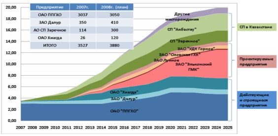 По плану работ на 2008 год, предполагается, что будет добыто 3880 тонн урана, в том числе, 300 тонн в Казахстане. В долгосрочной перспективе - к 2024 году - российские атомщики намерены выйти на рубеж 20 тысяч тонн урана в год.