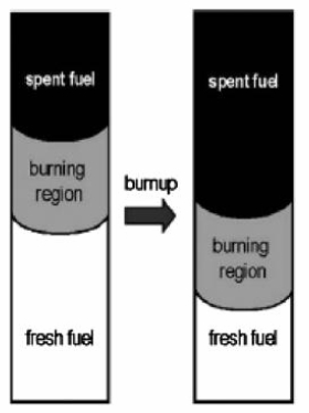 По мере эксплуатации реактора, ядра делящихся материалов в зоне выгорания будут потребляться, а в сырьевой зоне, наоборот, накапливаться. Этим и будет обусловлено медленное перемещение зоны выгорания в аксиальном направлении (сверху вниз), как показано на Рис.1. После того, как эксплуатация первого реактора будет завершена, оставшаяся в нём зона выгорания может быть использована для зарядки второго реактора.