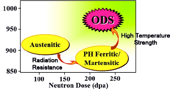 Преимущества дисперсноупрочнённых (ODS) сталей перед их конкурентами показаны на рисунке ниже по тексту, взятому из документов IGCAR.