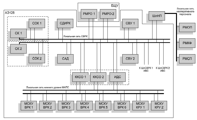 Структура СВРК-М, реализованной в виде распределенной локальной сети, приведена на Рис.1. Основными узлами, на которых функционирует ПО "Круиз", являются сервера оперативного контроля (СОК) и сервера верхнего уровня (СВУ). На базе ПО "Круиз" также было реализовано рабочее место контролирующего физика (РМКФ) и рабочее место операторов-технологов на БЩУ (РМРО).