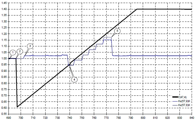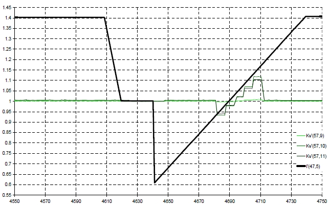 На архивных данных стационарного состояния энергоблока была запущена пилообразная модуляция токов всех ДПЗ КНИ №47 (ячейка 57). На рисунке показан пример реакции ПО "Круиз" на поступающие недостоверные данные (как ток ДПЗ, так и значения Kv на рисунке отнормированы на их стационарные значения). На рисунках отмечены следующие моменты: