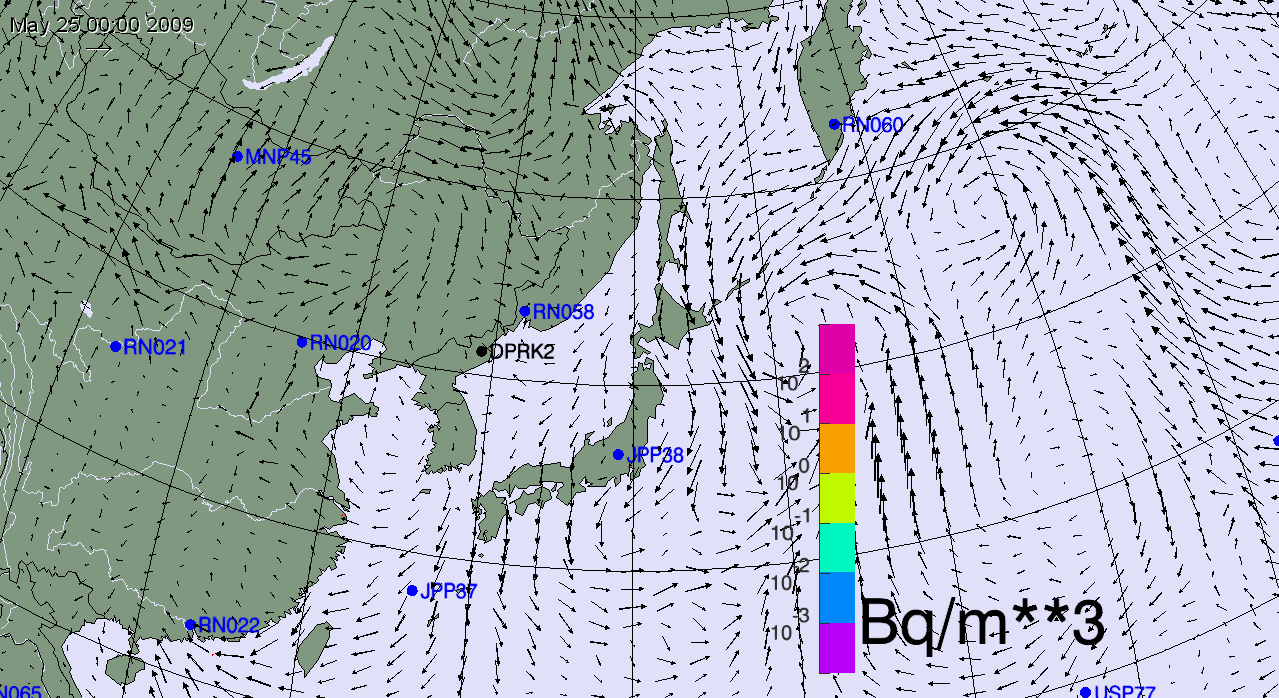 По прогнозам специалистов организации по ДВЗЯИ, занимающейся мониторингом ядерных испытаний, первые следы радиоактивного загрязнения от недавнего ядерного взрыва в Северной Корее могут быть обнаружены в период с 1 по 3 июня 2009 года.