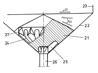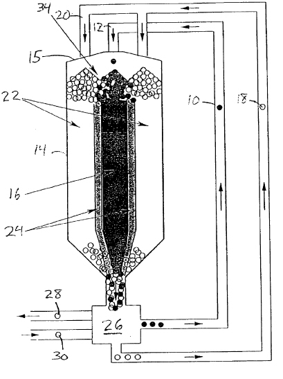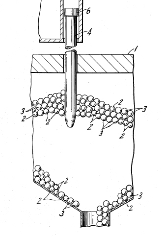 Большинство первых американских патентов, связанных с технологией ВТГР, выросли из германского реактора AVR, построенного и эксплуатировавшегося в Юлихе. Так, патент №3 960 656, выданный 1 июня 1976 года, описывает активную зону в форме воронки. Микротвэлы (29) засыпаются в неё сверху и затем постепенно проходят к нижнему выходу (26), предназначенному для выхода из зоны выгоревших топливных элементов.