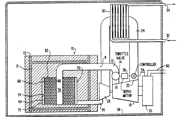 После открытия дроссельного клапана (14), гелий, нагреваемый в активной зоне (62) реактора, будет попадать прямо на турбину (18). Чем больше открывается задвижка клапана, тем быстрее вращается турбина.