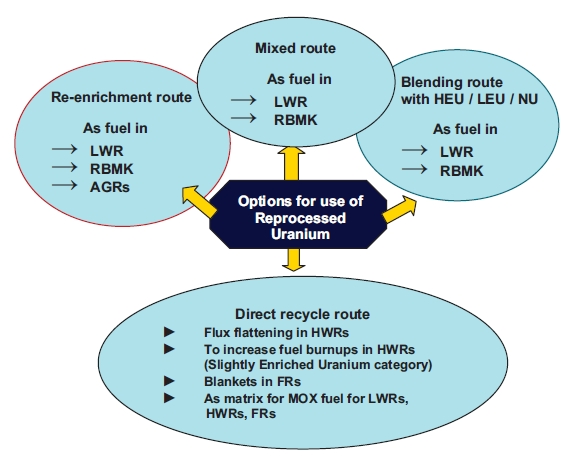 Уран, восстановленный после переработки ОЯТ (регенерированный уран), может быть возвращён в топливный цикл различными путями. Он может использоваться напрямую, может быть дообогащён, а также может быть смешан с обогащённым или природным ураном. Кроме этого, регенерат может применяться в качестве защитного материала в контейнерах для ОЯТ или получить иные применения, выходящие за пределы атомной энергетики.
