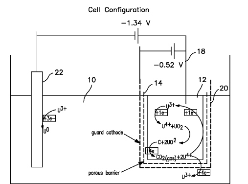 В результате серии химических и электролитических реакций уран выходит из корзины (12) и мигрирует по жидкому LiCl в направлении катода (22). В конечном итоге, в системе образуются газообразный CO2 и слой урана на катоде. Уран изымается из системы и отправляется в цех фабрикации топлива для PRISM.
