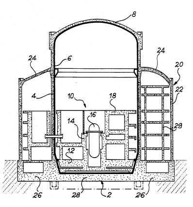 В патенте предполагается, что корпус реактора (16) установлен в бетонной или стальной шахте (14), которая, в свою очередь, соединена со структурой, названной в патенте "казематом" (18).