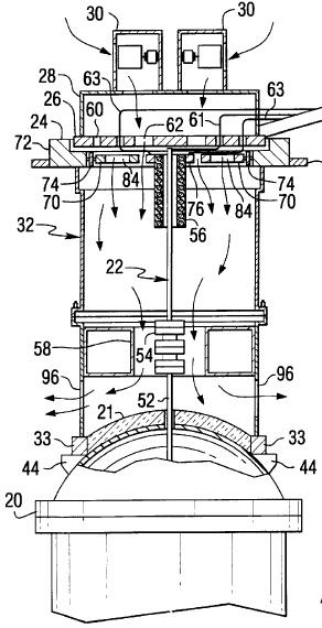 Исправить положение призваны вентиляторы (30). Они находятся выше плиты (26) и обеспечивают движение воздушных масс к приводам через вентотверстия (60). Для выхода потоков воздуха из системы предусмотрены люки (96).