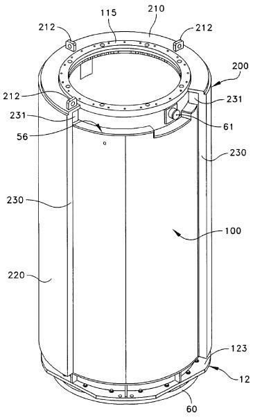 Чертёж из заявки показывает втулкообразную ракетную защиту (200), "намотанную" на контейнер (100) с выгоревшим топливом. Защита сделана из слоя стали или свинца толщиной не менее 5 дюймов. Попутно она задерживает выходящие из контейнера потоки гамма-лучей.