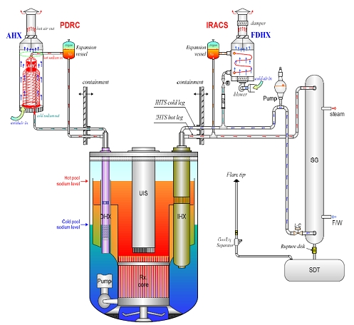 Из пассивной системы предполагается удалить все активные узлы. Её работа должна осуществляться за счёт естественной циркуляции и без вмешательства оператора. Одна из задач, стоящих перед конструкторами - предотвращение замерзания натрия в петлях PDRC (всего петель пока две). Сделать это предполагается за счёт правильного выбора входящего в состав PDRC теплообменника натрий-натрий. Он носит название DHX и должен обеспечить контакт натрия в пассивной системе с горячим натрием первого контура.