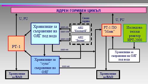 Обращение с ОЯТ в Болгарии Схема топливного цикла в Болгарии в обозримом будущем (после пуска АЭС "Белене") будет выглядеть следующим образом. Свежее ядерное топливо в Болгарию будет поступать для блоков-тысячников АЭС "Козлодуй" и АЭС "Белене". Поставки свежего топлива для блоков с реакторами ВВЭР-400 в данный момент прекращены, так как эти блоки выводятся из эксплуатации. ОЯТ с блоков-тысячников (и ранее с блоков с реакторами ВВЭР-440) поступает на первой стадии в водное хранилище. Далее предполагается его размещение в сухом хранилище отработавшего топлива. Из водного, а в дальнейшем и из сухого хранилища, ОЯТ ВВЭР-440 вывозится в Россию для переработки на ПО "Маяк". Аналогичные действия в будущем должны осуществляться и для ОЯТ ВВЭР-1000. После переработки выделенные уран и плутоний должны возвращаться в топливный цикл, а образовавшиеся ВАО - направляться в долгосрочное хранилище. ОЯТ исследовательского реактора ИРТ-2000 также помещается в водное хранилище, откуда после выдержки вывозится для переработки на ПО "Маяк". ![]() В докладе Томова рассмотрены четыре сценария накопления ОЯТ в Болгарии. Вариант 1. Эксплуатация АЭС "Козлодуй" до конца расчётного срока службы без ввода новых мощностей. Вариант 2. Продление эксплуатации энергоблоков 5 и 6 АЭС "Козлодуй"на 15 лет. Вариант 3. Эксплуатация АЭС "Козлодуй" до конца расчётного срока службы и ввод в эксплуатацию блоков №№1-2 АЭС "Белене". Вариант 4. Продление эксплуатации энергоблоков 5 и 6 АЭС "Козлодуй"на 15 лет и ввод в эксплуатацию блоков №№1-2 АЭС "Белене". По состоянию на 31 мая 2010 года, на площадке Козлодуй в БОК и ХОГ было накоплено 5016 отработавших кассет ВВЭР-440 и 540 кассет ВВЭР-1000. В терминах массы, это составляет 577,852 тонн и 211,520 тонн тяжёлых металлов, соответственно. Приблизительно это эквивалентно активностям 1,14×1019 Бк и 1,70×1019 Бк. Оставшиеся в эксплуатации блоки №5-6 АЭС "Козлодуй" до конца расчётного срока службы произведут следующее количество отработавших сборок: блок №5 - 457 кассет до 2017 года, блок №6 - 667 кассет до 2021 года. В случае продления эксплуатации, эти показатели изменятся следующим образом: блок №5 - 1087 кассет до 2032 года, блок №6 - 1297 кассет до 2036 года. Два блока АЭС "Белене" за проектный срок службы 60 лет произведут в совокупности 5198 выгоревших кассет. Таким образом, для сценариев 1-4, описанных выше, общее количество отработавших кассет ВВЭР-1000 будет меняться от 1664 до 8086, а общая активность ОЯТ (с учётом ОЯТ ВВЭР-440, находящегося в данный момент в Болгарии) - от 6,38×1019 Бк до 2,66×1020 Бк. Вывоз ОЯТ в Россию Ежегодно Болгария ввозит из России по два транспорта в составе 48 кассет каждый (42 сборки для частичной перегрузки и 6 запасных сборок) для блоков №№5-6 АЭС "Козлодуй" с ВВЭР-1000. Ежегодно для переработки в Россию экспортируется по 240 кассет реакторов ВВЭР-440 и 96 кассет ВВЭР-1000. Количество вывозимых в Россию отработавших кассет определяется пропускной способностью системы транспортировки ОЯТ. Начиная с 1989 года, всего в Россию было доставлено 1888 выгоревших кассет ВВЭР-440 и 864 кассеты ВВЭР-1000 на условиях возврата в Болгарию остеклованных ВАО, образующихся в ходе переработки ОЯТ. При темпе вывоза в Россию 240 кассет ВВЭР-440 в год, козлодуйская площадка будет полностью освобождена от ОЯТ такого типа через 21 год, или к 2031 году. При темпе вывоза в Россию 96 кассет ВВЭР-1000 в год, на момент проектного вывода из экс