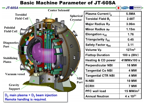 В Японии начинается подготовка к строительству токамака JT-60SA AtomInfo.Ru, ОПУБЛИКОВАНО 01.03.2011 Подготовка к сооружению сверхпроводящей термоядерной установки JT-60SA начинается в Японии. В марте специалисты приступят к сборке вакуумной камеры, одного из главных узлов токамаков, пишет "Denki Shimbun". ПРОДОЛЖЕНИЕ ПОСЛЕ ФОТО Токамак JT-60SA ![]() Полномасштабные эксперименты на JT-60SA будут производиться, начиная с 2015 года, напоминает газета. JT-60SA должен прийти на смену японскому токамаку JT-60. Принципиальное отличие нового аппарата заключается в том, что в нём будут использоваться сверхпроводящие магнитные катушки. Финансирование сооружения нового токамака ведётся совместно Японией и рядом европейских государств. Среди заявленных целей JT-60SA - дополнять исследования, проводящиеся в обоснование строительства реактора ITER, а также создать технологический базис для разработки демонстрационного термоядерного реактора DEMO. Ключевые слова: Азия, Япония, Синтез Другие новости: Выгрузка топлива на энергоблоке АЭС "Бушер" - необходимая мера предосторожности Официальное сообщение ГК "Росатом" по ситуации на Бушерской АЭС. Аль-Каеда освободила троих из семерых захваченных французских атомщиков Четверо французов остаются в плену у боевиков. Арестованный в Пакистане сотрудник ЦРУ мог снабжать Аль-Каеду ядерными материалами - источники Реймонд Дэвис находится под судом в Пакистане за убийство двух сотрудников пакистанских спецслужб. |