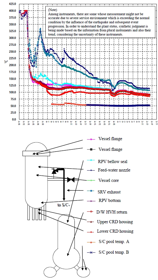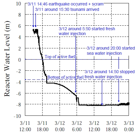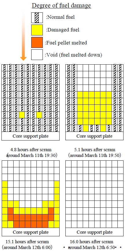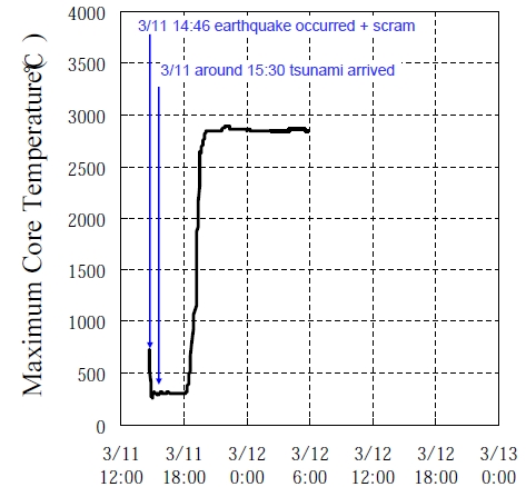 Фукусима: пять часов, решивших всё AtomInfo.Ru, ОПУБЛИКОВАНО 16.05.2011 Японская компания TEPCO переосмысливает события первых дней аварии на АЭС "Фукусима Дайичи". На первом блоке топливо было расплавлено спустя 16 часов после землетрясения. Цунами не стало первоисточником проблем на станции, оно лишь усугубило их. В двух населённых пунктах за пределами 20-км зоны началась эвакуация населения. Ускоренное расплавление Расплавление топлива в реакторе первого блока станции произошло скорее, чем считалось ранее. В воскресенье TEPCO представила результаты нового анализа, из которого следует - активная зона была разрушена спустя 16 часов после землетрясения 11 марта 2011 года. С новыми данными публику ознакомили в воскресенье. Анализ показывает, что к 0650 утра 12 марта по токийскому времени большая часть топлива в реакторе первого блока была расплавлена и стекла вниз, на днище корпуса. Использовать страшное слово "кориум" японцы пока не торопятся. Конечно, описываемая специалистами TEPCO субстанция в первом блоке образуется как кориум и ведёт себя как кориум. Но о точной степени повреждения ядерного топлива на блоке говорить пока рано - есть только численные модели. Неприятное следствие из нового анализа для ликвидаторов - затопить водой корпус реактора первого блока не удастся. В нём почти наверняка есть дыры, образовавшиеся при плавлении топлива. TEPCO возвращается к идее о замыкании контура на блоке с обязательной дезактивацией циркулирующей в нём воды. Подробности новой редакции плана станут известны вскоре. Блок №1, день №1 Что же происходило на первом блоке в первые сутки аварии? Специалисты TEPCO представляют себе это следующим образом. Практически сразу после прихода цунами, уровень воды в реакторе начал снижаться. К 1800 11 марта уровень упал до высоты активной части топлива. С этого момента, в зоне начинается оголение твэлов с последующим перегревом и разрушением оголённых участков. Резкий спад уровня продолжался, и спустя полтора часа топливо целиком осталось без водного охлаждения. Теплоотвод за счёт пара, очевидно, продолжался, однако судить об его эффективности по данным, представленным TEPCO, затруднительно. Падение уровня этим не ограничилось и шло до 0550 12 марта. В этот момент на блоке удалось возобновить подачу несолёной воды в реактор. После нескольких колебаний, уровень стабилизировался на отметке -8(м). Для понимания - активная часть топлива расположена по этой шкале между отметками -4(м) и 0(м). Закачка несолёной воды в реактор была прекращена в 1450 12 марта. Спустя пять с небольшим часов, в 2000 12 марта, персонал приступил к закачке морской воды. Как следует из других результатов анализа, это действие не могло предотвратить расплавление активной зоны - расплавление к тому моменту уже состоялось. Изменение уровня воды в корпусе реактора блока №1 в период между 11 и 13 марта ![]() Максимальная температура топлива в активной зоне снизилась при сбросе АЗ примерно до 300°C и оставалась у этой отметки до тех пор, пока твэлы были прикрыты водой. Иными словами, до 1800 11 марта. Начиная с 1800, аварию можно смело называть тяжёлой. Температура топлива стала резко возрастать. Как уже было сказано, спустя полтора часа активная часть топлива оказалась полностью оголённой. Примерно за это же время, максимальная температура топлива достигла 2800°C. Изменение максимальной те