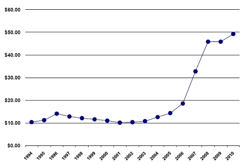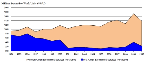 США приобрели в 2010 году 47 млн фунтов U3O8 AtomInfo.Ru, ОПУБЛИКОВАНО 02.06.2011 Владельцы и эксплуатирующие организации США приобрели в 2010 году урана в количестве 47 миллионов фунтов в пересчёте на U3O8. Об этом говорится в обзорном докладе, опубликованном министерством энергетики Соединённых Штатов. Усреднённая цена за фунт U3O8 (здесь и далее - эквивалент) составила в 2010 году 49,29 долларов. По сравнению с 2009 годом, объём закупок урана снизился на 7%. В 2009 году американские атомные компании приобрели порядка 50 миллионов фунтов в пересчёте на U3O8. У американских производителей в 2010 году было куплено всего 8% от общего объёма урана по средней цене 45,25 долларов за фунт U3O8. Остальной уран приобретался за рубежом по средней цене 49,64 долларов за фунт. Средняя цена (доллары) за эквивалентный фунт U3O8 ![]() 41% от общего объёма купленного урана имеет своим происхождением Казахстан, Россию и Узбекистан. На долю австралийских и канадских добытчиков приходится 37%. Оставшиеся 14% распределились между Бразилией, Чешской Республикой, Германией, Венгрией, Малави, Намибией, Нигером, ЮАР и Украиной. Всего уран в 2010 году в США поставляли 23 компании, или на шесть меньше, чем в 2009 году. Больше всего уран поставлялся в форме U3O8 - 63%. В форме гексафторида урана природного обогащения - 37%. На спотовом рынке в 2010 году американские компании приобрели 18% от общего объёма урана, остальные 82% были получены по долгосрочным контрактам. Средняя цена за фунт U3O8 при спотовых покупках составила 43,99 долларов, по долгосрочным контрактам - 50,43 долларов. Обогащение урана В 2010 году владельцы и эксплуатирующие организации США передали 45 миллионов фунтов U3O8 американским и иностранным компаниям для обогащения. Из этого количества, 57% было передано американским компаниям и 43% зарубежным. Всего для американской атомной отрасли было выполнено в 2010 году разделительных работ в объёме 14 миллионов ЕРР семью поставщиками услуг. Средняя цена составила 136,14 долларов/ЕРР, или на 4% выше, чем в 2009 году. При этом, американское происхождение имеют только 16% от общего объёма ЕРР, остальные работы (84%) по разделению были выполнены за рубежом. На долю России приходится 37% ЕРР, на долю Германии, Нидерландов и Великобритании (концерн URENCO) - также 37% ЕРР. Объёмы разделительных работ, млн ЕРР, ![]() Ключевые слова: Уран, ЯТЦ, Обогащение, США Другие новости: Россия и Болгария не успеют к 1 июня парафировать EPC-контракт по АЭС Белене - Росатом Несмотря на то, что до 1 июня текущего года EPC-контракт парафирован не будет, переговоры идут хорошо. Первую партию облучённого топлива с Ленинградской АЭС доставят на ГХК в декабре Первая партия, которая поступит по железнодорожным путям, будет весом около 65 тонн по урану. Ростехнадзор выдал лицензию на модернизацию третьего блока Кольской АЭС до конца 2011 года Если всё будет завершено успешно, то эксплуатация данного энергоблока может быть продлена. |