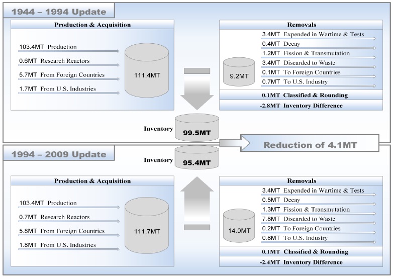 Запасы военного плутония в США AtomInfo.Ru, ОПУБЛИКОВАНО 09.09.2012 Соединённые Штаты опубликовали обновленные данные по общему количеству накопленного в стране плутония. Документ под названием "The United States Plutonium Balance, 1944-2009" служит дополнением к первому в истории США сводному документу по плутонию, опубликованному в 1996 году - документу "Plutonium: The First 50 Years". Данные из документа 1996 года Исходный документ 1996 года был скомпилирован на основе данных бумажных архивов, берущих начало в 40-ых годах, и электронных архивов по производству и утилизации плутония в США, ведущихся с конца 60-ых годов. По состоянию на 1994 год было определено, что общие запасы плутония, принадлежащего министерствам энергетики и обороны США, составляют 99,5 тонн. Из них, 66,1 тонн плутония хранилось на военном заводе "Pantex" (Амарилло, штат Техас). Было выяснено также, что общее количество оружейного плутония, избыточного для нужд обороны страны, составляет 38,2 тонны. Кроме этого, ещё 3,9 тонн плутония содержалось в отходах на девяти различных площадках министерства энергетики. В документе отмечалось, что суммарный объём произведенного и приобретённого военного плутония в США за 50 лет (1944-1994 годы) составил 111,4 тонн. Из них, объём производства на промышленных реакторах составил 103,4 тонны. Исследовательские реакторы дали 0,6 тонны плутония, из других государств ввезено 5,7 тонн, от американской атомной отрасли получено 1,7 тонн. Расход плутония за эти же 50 лет составил 9,2 тонн. По 3,4 тонны было потрачено во время испытаний и направлено в отходы, а распалось 0,4 тонны плутония. Анализ выявил наличие расхождений в балансе между приходом и расходом военного плутония около 2,8 тонн. Баланс военного (принадлежащего министерствам энергетики и обороны) плутония ![]() Данные из документа 2012 года В документе 2012 года выпуска приводятся обновленные данные по плутониевому балансу США (по состоянию на 2009 год). Общее количество плутония в обоих министерствах сократилось до 95,4 тонн. В первую очередь, это произошло за счёт увеличения до 7,8 тонн общего количества военного плутония, классифицированного как отходы. Возросли запасы плутония, складированные на заводе "Pantex" - до 67,7 тонн. Это делается в рамках запущенной в США программе по централизации хранения оружейных материалов. Хотя баланс приходов и расходов по-прежнему не сходится, расхождения между статьями удалось несколько сократить - до 2,4 тонн. Баланс был уточнён в ходе работ по выводу из эксплуатации и повторной инвентаризации оборудования на двух американских площадках - Роки Флэтс и Ханфорд. Самое серьёзное изменение, сделанное в документе, касается количества оружейного плутония, избыточного для нужд обороны. Теперь оно составляет 43,4 тонны. В 1994 году количество избыточного плутония было всего лишь 38,2 тонны. Ключевые слова: Плутоний, ЯОК, США Другие новости: Обнародовано свежее видео с похищенными в Нигере французскими атомщиками Работники AREVA и субподрядчика, захваченные в 2010 году, живы. США расширят программу по использованию MOX-топлива На производство MOX-топлива для тепловых реакторов будет выделено 45, а не 34 тонны оружейного плутония. Монтаж корпуса реактора энергоблока №1 Нововоронежской АЭС-2 завершён Операция закончена 7 сентября. |