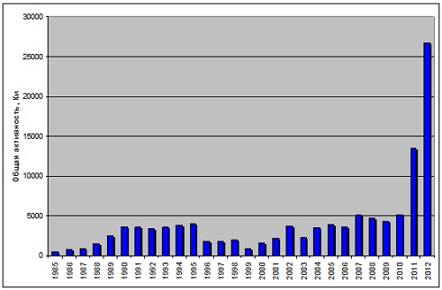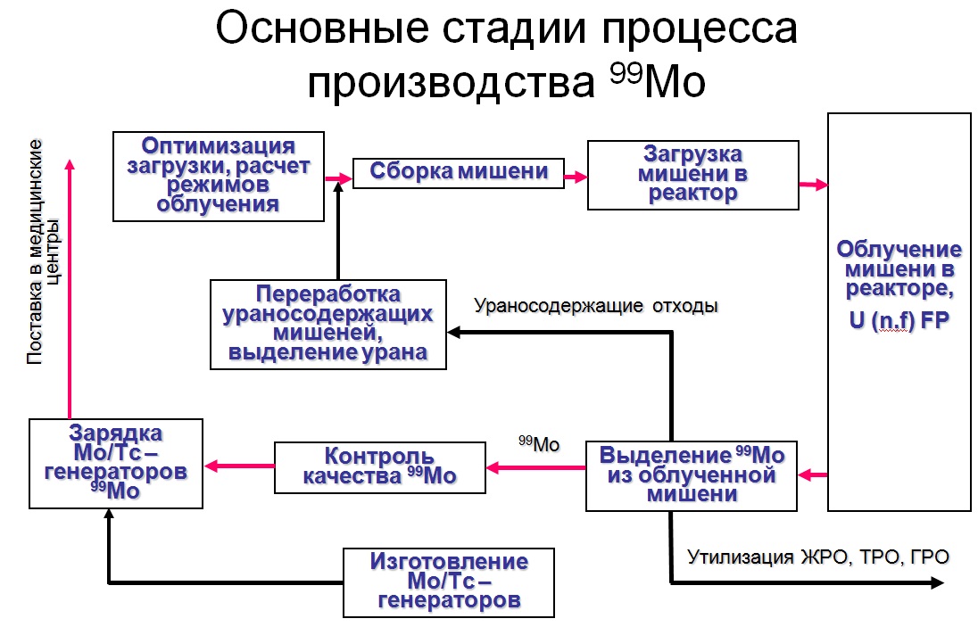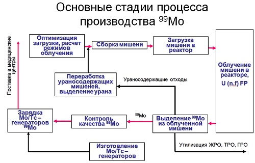 Молибден и технеций из Обнинска AtomInfo.Ru, ОПУБЛИКОВАНО 14.09.2013 Обнинский филиал НИФХИ имени Л.Я.Карпова отметил 3 сентября 2013 года важное событие - завершение ремонта в соответствии с правилами GMP первого этажа здания цеха зарядки генераторов технеция-99m. На собрании, посвящённом этому событию, директор филиала Олег КОЧНОВ рассказал о производстве радионуклида медицинского назначения 99Mo и молибден-технециевых генераторов в НИФХИ. Доли и поставщики Текущий мировой спрос на 99Mo составляет около 12000 Ки в неделю. Из этого количества, примерно 40% удовлетворяет Канада с реактором NRU. На долю Нидерландов (HFR) приходится 25%, Бельгии (BR-2) - 20%. Южная Африка на "Safari-1" производит 10% от мировых потребностей. На долю остальных стран - Аргентина, Австралия, Россия - приходится 5%. В России и СНГ основным производителем молибдена-99 выступает НИФХИ (95%). Он производится в Обнинске осколочным методом. Докладчик назвал два других осколочных российских поставщика - ПО "Маяк" (Озёрск) и НИИАР. Активационным методом 99Mo получают на Ленинградской АЭС, в НИИ ЯФ Томского политехнического университета, ПИЯФ (Гатчина), а также, если говорить о странах СНГ, в ИЯФ (Узбекистан). В обнинском филиале НИФХИ молибден-99 получают в двух вертикальных экспериментальных каналах (ВЭК) на реакторе ВВР-ц. В 2012 году для тех же целей были смонтированы два дополнительных ВЭК. Реактор ВВР-ц ![]() Расположение ВЭК для производства молибдена-99 на ВВР-ц ![]() Суммарная годовая активность 99Mo на день выпуска на ЯР ВВР-ц ![]() Технические детали Основные стадии процесса производства 99Mo показаны на следующем рисунке. Щёлкните левой клавишей мыши для просмотра. ![]() Облучательное устройство для наработки 99Mo на ВВР-ц. ![]() Докладчик перечислил требования к мишени. Она должна: - иметь размеры и конструкцию, которые позволяют обеспечить её загрузку в канал ядерного реактора и выгрузку из него; - мишень должна содержать достаточное количество 235MU, чтобы получить необходимое количество 99Мо; - мишень должна обеспечить барьер, чтобы не допустить выброса радиоактивных продуктов и особенно газов во время и после облучения; - конструкция мишени должна быть легко разборной в условиях горячей камеры; - конструкция и состав мишени должны обеспечивать химическую переработку её в горячей камере за минимальное время. Мишень для наработки 99Мо на реакторе ВВР-ц. ![]() В докладе прозвучали также основные этапы модернизации мишени на ВВР-ц. На первых порах использовалась мишень типа "стакан в стакане" с застойной зоной, сейчас же используется проточная мишень. Олег Кочнов остановился также на такой важной для производителей радиоизотопов проблеме, как регенерация урана, остающегося в мишени после облучения. В 2008 году в филиале были начаты работы по регенерации, а в 2013 году на реакторе было произведено 60 Ки молибдена-99 в мишенях из регенерата. Потери урана в разработанном обнинскими радиохимиками технологическом процессе регенерирования составляют не более 2%. Содержание 235U определяется по гамма-линии 0,185 МэВ. Генераторы технеция Генератор 99мТс КСУ-3 ФХИ ![]() Генератор 99мТс ГТ-4К ![]() За всё время, начиная с 1988 года, филиалом было выпущено генераторов разных номиналов от 4 до 19 ГБк более 40 тысяч штук. В 2012 году филиал превысил исторический максимум, впервые в своей истории превзойдя рекордные показатели советских времён. Производс