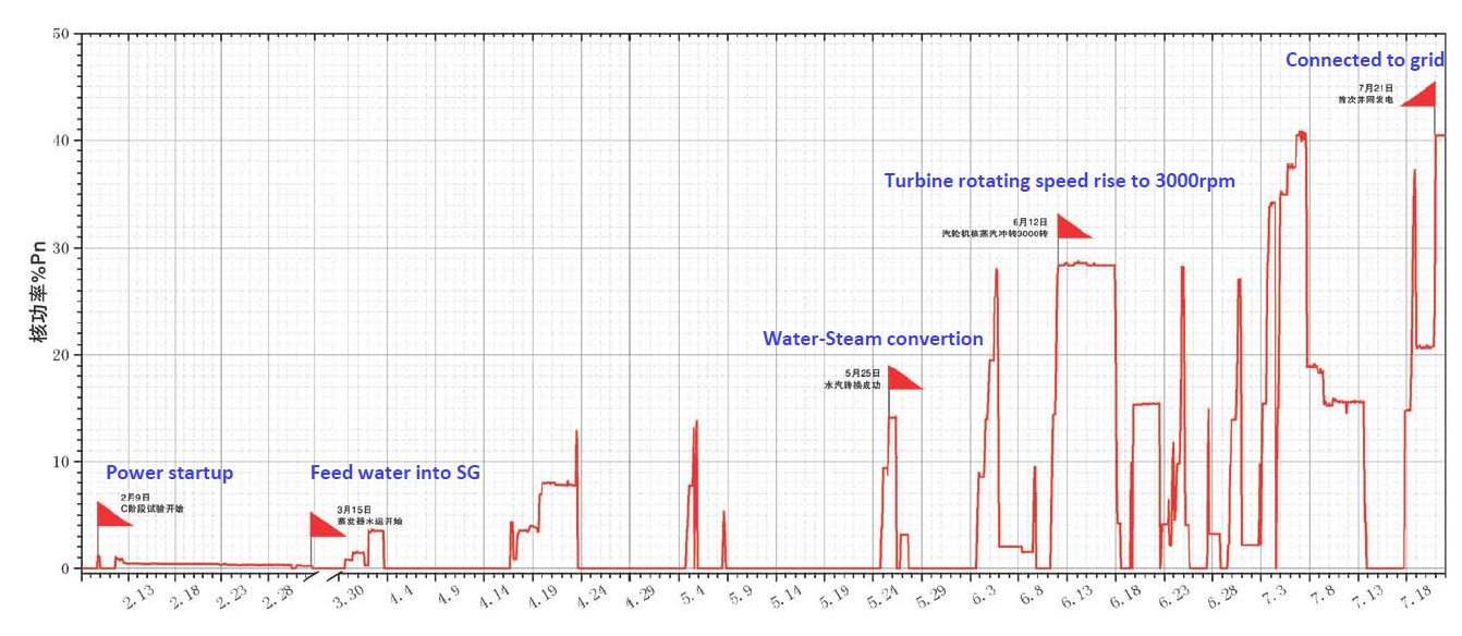 Китай - CEFR и далее AtomInfo.Ru, ОПУБЛИКОВАНО 04.10.2013 Китай решительно настроен продолжать свою быструю натриевую программу, осваивать реактор CEFR и разрабатывать новые реакторные проекты. Такой вывод следует из текста доклада китайского института атомной энергии (CIAE), имеющегося в распоряжении электронного издания AtomInfo.Ru. Автор доклада - Donghui Zhang. CEFR Проект CEFR обязан своему рождению известному плану "863" развития в Китае высоких технологий, принятому в 1986 году. Бюджет проекта составил свыше 2,5 миллиардов юаней (более 400 миллионов долларов). Окончательное решение о начале проекта было принято 9 декабря 1995 года. Эскизный проект получил одобрение 13 ноября 1997 года. Первый бетон был уложен 30 мая 2000 года. Первый выход реактора CEFR на критику состоялся 21 июля 2010 года. Ровно через год, 21 июля 2011 года, реактор был впервые подключён к сети. Здание CEFR ![]() Площадка CEFR на карте Китая ![]() 9 февраля 2011 года, первый подъём мощности до 1%. ![]() CEFR представляет собой быстрый реактор с натриевым теплоносителем. Тепловая мощность - 65 МВт, электрическая мощность - 20 МВт(эл.). В базах данных МАГАТЭ он проходит как энергоблок, а не исследовательский реактор. Высота активной зоны - 45 см, эквивалентный диаметр - 60 см. Первая топливная загрузка изготовлена из оксида урана, в дальнейшем (после 2015 года) планируется переход на MOX. Максимальная линейная мощность активной зоны - 430 Вт/см. Поток нейтронов составляет 3,7×1015 н/(см2с). Входная температура теплоносителя - 360°C, выходная - 530°C. Проектный срок службы реактора - 30 лет. Первый контур состоит из двух петель, в каждой по два промежуточных теплообменника. Общая масса натрия в первом контуре 260 тонн, во втором - 48,2 тонны. В третьем контуре пар с температурой до 480°C. В 2011 году на CEFR были произведены энергопуск и первое подключение к сети (на 40%). Освоение мощности шло ступеньками - 1%, 9,4%, 25%, 40%, номинал. Освоение мощности в период с 9 февраля по 21 июля 2011 года. ![]() На тепловой мощности 2,5 МВт был проведён эксперимент по определению обратных связей (TOP test). В ходе эксперимента за счёт поднятия стержней СУЗ в реактор была введена положительная реактивность +10 pcm. Мощность реактора начала расти и спустя семь минут достигла значения 3,09 МВт. Достигнув пика, мощность начала снижаться за счёт обратных связей и затем стабилизировалась на значении 2,81 МВт. Расчёты давали более высокое значение мощности в конце переходного процесса. Это говорит о том, что отрицательные обратные связи оказались более сильными, чем предполагалось в проекте. График зависимости мощности от времени в эксперименте по определению обратных связей ![]() К запланированным экспериментам в 2011 году добавился ряд "незапланированных". В период с 23 апреля по 2 июля 2011 года произошло восемь срабатываний АЗ - в пяти случаях по сигналу о падении расхода воды, в остальных трёх по сигналу о падении давления воды. При этом в пяти случаях появление сигнала было вызвано "возмущениями" в системе КИПиА, в двух случаях ошибками персонала и в одном случае подключением оборудования.