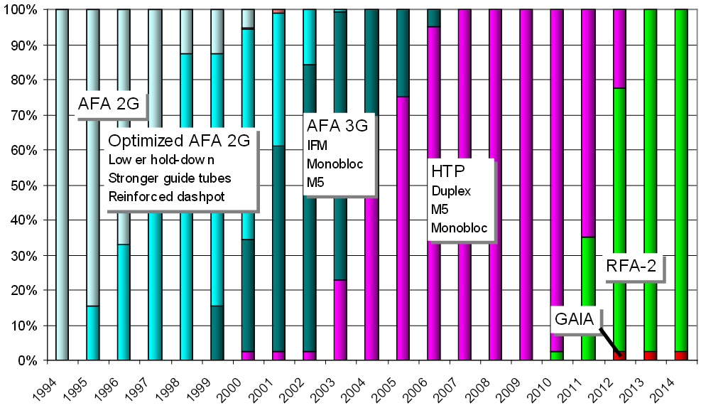 В 2015 году в США будет загружена опытная партия кассет GAIA AtomInfo.Ru, ОПУБЛИКОВАНО 20.07.2014 Шесть эксплуатирующих организаций США создали технический совет по внедрению топлива GAIA от французской группы AREVA для реакторов, сообщается в пресс-релизе группы. Среди них - "Dominion", "Duke Energy", "Exelon" и PSEG. В рамках программы по внедрению весной 2015 года на одном из блоков будет загружена опытная партия из восьми кассет GAIA. "Топливо GAIA предлагает заказчикам оптимальные эксплуатационные свойства и глубокое выгорание", - заявил старший исполнительный вице-президент AREVA Гийом Дюро (Guillaume Dureau). Работы над кассетами GAIA для реакторов PWR были начаты в 2001 году компанией "Framatome", вошедшей вскоре после этого в состав группы AREVA. Первая партия кассет GAIA была загружена во Франции в 2012 году. Сроком начала коммерческих поставок исходно назывался 2015 год. Небольшая опытная партия кассет GAIA была в 2012 году также загружена на блоке №3 АЭС "Ringhals" (Швеция). Состав активной зоны Ringhals-3. ![]() Ключевые слова: ЯТЦ, Фабрикация, США, AREVA Другие новости: Пока мы не ощущаем и не испытываем реальных проблем поставок с украинских предприятий. Росатом 23 июля может подписать прединвестиционное соглашение на сооружение АЭС в Иордании Параллельно готовятся два документа. Госкорпорация Росатом объявляет о кадровых изменениях в "Uranium One Holding" и "Uranium One Inc." Вадим Живов покидает посты президента. |
