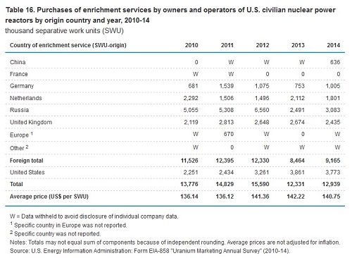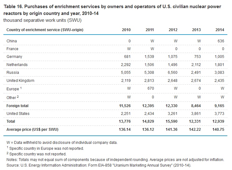 АЭС США закупили в 2014 году 12,939 миллионов ЕРР AtomInfo.Ru, ОПУБЛИКОВАНО 31.05.2015 Компании-операторы АЭС США закупили в 2014 году 12,939 миллионов ЕРР разделительных работ. Такие данные приводятся в очередном отчёте агентства энергетической информации (EIA) при министерстве энергетики США. На долю американских компаний приходится менее 30% от общего количества закупленных ЕРР - а именно, 3,77 миллиона ЕРР. Агентство не даёт раскладку по компаниям, но очевидно, что практически весь данный объём приходится на компанию "URENCO USA". На долю европейских предприятий концерна URENCO приходится чуть более 40% от закупленных услуг по обогащению - 5,24 миллионов ЕРР. Причём по традиции больше всего ЕРР было закуплено у британской части концерна (2,43 миллиона ЕРР), а меньше всего у германской (1 миллион ЕРР). Объём закупок ЕРР у России составил в 2014 году 3,08 миллионов ЕРР. Это больше, чем в 2013 году (2,49 миллионов ЕРР), но примерно в два раза меньше, чем было закуплено в 2012 году (6,56 миллионов ЕРР). У Китая в 2014 году было закуплено 0,64 миллионов ЕРР. У Франции закупок ЕРР не производилось. Кроме того, было закуплено порядка 0,2 миллионов ЕРР у неназываемых государств (в том числе, европейских). Средняя цена ЕРР для американских АЭС в 2014 году составила 140,75 долларов, незначительно подешевев по сравнению с 2013 годом (142,22 долларов). Абсолютное большинство услуг по обогащению (свыше 95%) приобреталось по долгосрочным контрактам. Закупка ЕРР для АЭС США в 2010-2014 года, данные EIA. ![]() Ключевые слова: ЯТЦ, Обогащение, США, URENCO Другие новости: На учениях "Safeguard Temelin 2015" отработают удары по самолётам и дронам, угрожающим станции Удары по дронам отработают в четверг. Нижняя палата парламента Франции вновь ограничила атомную энергетику Согласование с сенатом продолжается. Блок работает на 75% своей тепловой мощности и 675 МВт - электрической. |