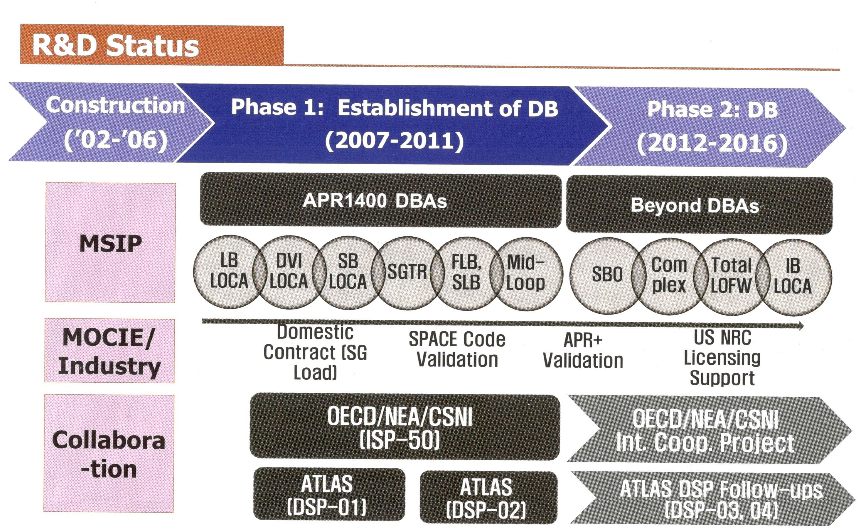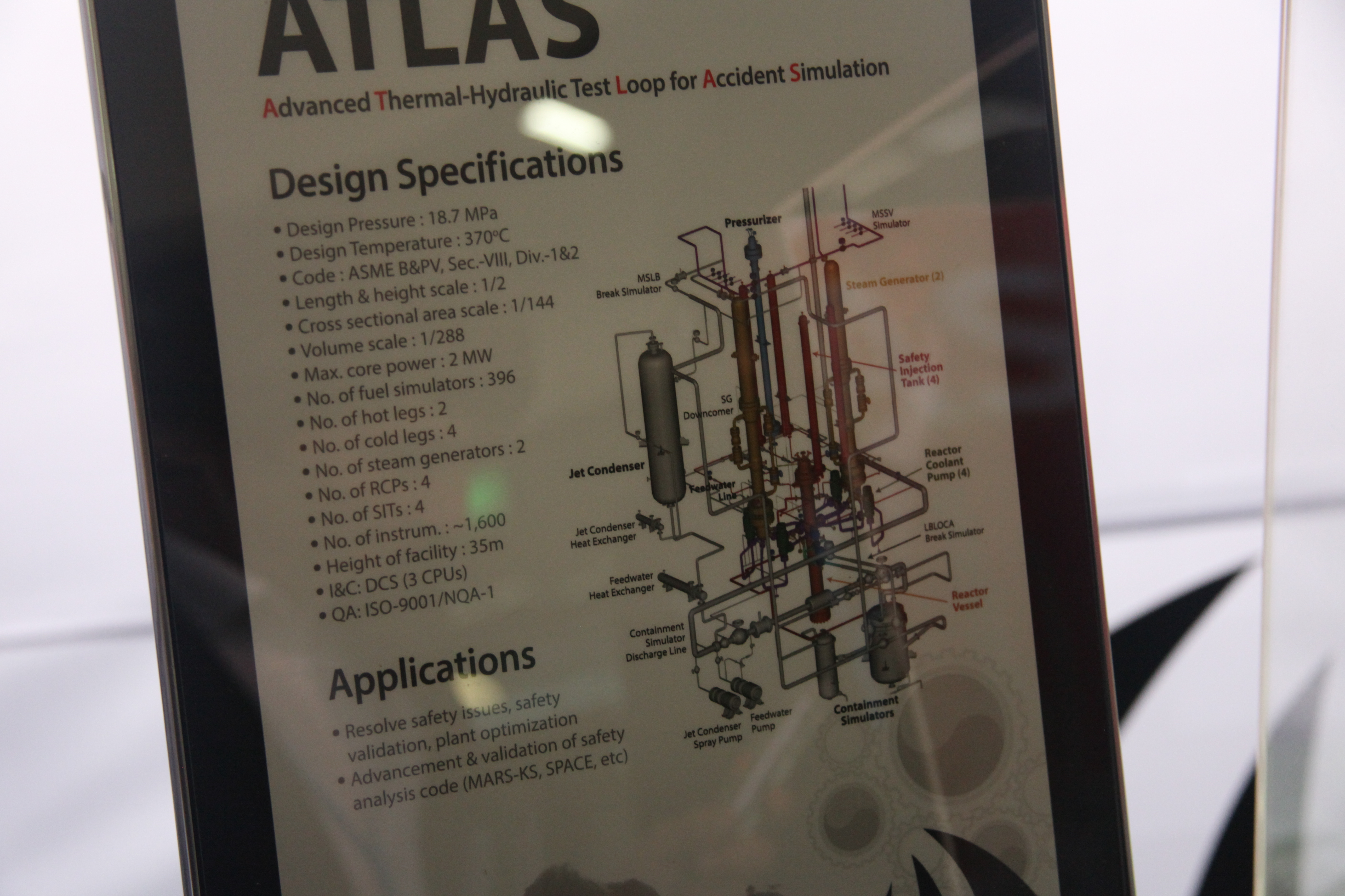 ATLAS - стенд для APR-1400 AtomInfo.Ru, ОПУБЛИКОВАНО 28.09.2015 Интегральный стенд ATLAS, созданный в Южной Корее, помогает атомщикам этой страны в исследованиях, связанных с предотвращением тяжёлой аварии. Ознакомиться с основными параметрами стенда могли посетители выставки, организованной в рамках 59-ой сессии генеральной конференции МАГАТЭ, которая прошла в Вене. Макет стенда ATLAS. ![]() Стенд для моделирования APR-1400 Стенд ATLAS (Advanced Thermal-hydraulic test Loop for Accident Simulation) - экспериментальная установка, созданная для реакторного проекта APR-1400. Основное назначение стенда - моделирование переходных и аварийных процессов, включая проектные и запроектные аварии, при давлениях и температурах, характерных для реакторов APR-1400. О необходимости создания стенда в Южной Корее заговорили в 1997 году, и он сразу был увязан с программой APR-1400 - реактора, который в этой стране был выбран на должность рабочей лошадки. На проектирование стенда и различные согласования понадобилось пять лет, а пуск ATLAS состоялся в 2006 году. "Конфигурация стенда ATLAS соответствует типичной конфигурации APR-1400. Конечно, в МАГАТЭ мы привезли только макет 1:40 стенда, но вы можете представить себе, как стенд выглядит в реальности", - рассказывает представитель южнокорейской делегации на выставке Чхве Ки Ён (Choi Ki Young). Естественно, ATLAS - теплогидравлический стенд, а не реактор. Топливные сборки в нём заменены имитаторами с электронагревателями. Стенд имитирует основное оборудование первого контура APR-1400 - корпус реактора, парогенераторы, насосы, баки системы расхолаживания (safety injection tanks) и другие узлы. На стенде аккуратно смоделирован принятый в APR-1400 принцип - реактор имеет две петли, в каждой петле по одному парогенератору и по два ГЦН, причём горячий участок (hot leg) один, а холодных участков (cold leg) по два. Такое решение в APR-1400 было заимствовано из более ранней разработки южнокорейских атомщиков - реактора OPR-1000, на действующих блоках с которыми компоновка "две петли - четыре насоса" хорошо себя зарекомендовала. Компоновка "две петли - четыре насоса" в реакторе APR-1400 ![]() У макета ATLAS. ![]() Параметры ATLAS Разумеется, стенд по геометрическим размерам меньше реальной реакторной установки. По высоте он соотносится с ней как 1:2, по диаметру как 1:12, соответственно, по объёму как 1:288. С этой точки зрения он проигрывает стендам LSTF (Япония) и PKL (Германия), у которых соотношения с объёмом реальных установок равны 1:48 и 1:146, соответственно. Более точные соотношения по отдельным узлам ATLAS - см. таблицу ниже по тексту. Зато по максимальному давлению ATLAS на первом месте - 18,7 МПа. У японцев данный параметр равен 17,95 МПа, а у немцев - всего лишь 4,5 МПа. Число имитаторов топливных сборок в ATLAS составляет 390. Проектная температура - 370°C. Общее количество разнообразных датчиков, имеющихся на стенде - порядка 1600. "Мы можем измерять практически всё", - говорит Чхве Ки Ён. Основные параметры стенда ATLAS. ![]() Соотношение характеристик APR-1400 и ATLAS. ![]() Экспериментальные работы Экспериментальные работы на стенде ATLAS ведутся с 2007 года. Первые пять лет были посвящены изучению проектных аварий на APR-1400, а с 2012 по 2016 годы на стенде моделируются запроектные аварии - например, такие, как полное обесточивание блока (SBO). Моделирование аварии с потерей теплоносителя через большой разрыв (LBLOCA), выполненное на первой стадии экспериментов, оказало реальную помощь проектантам APR-1