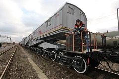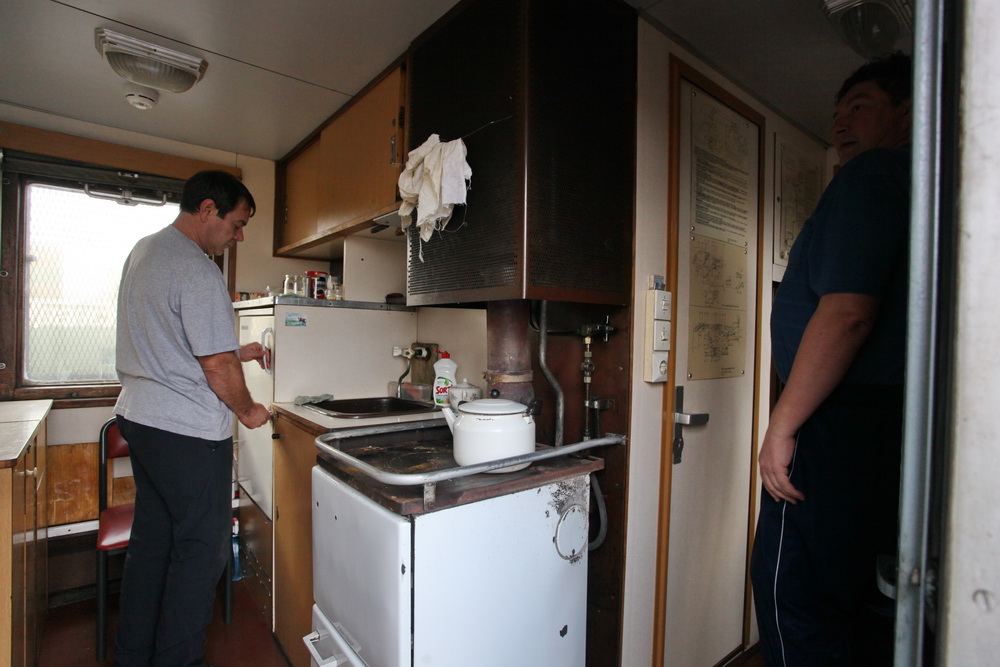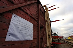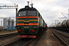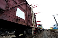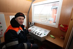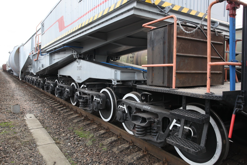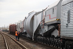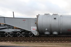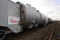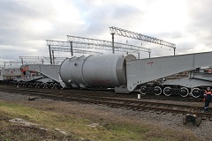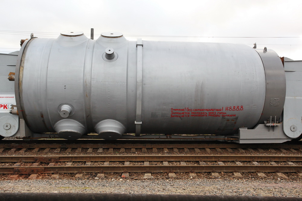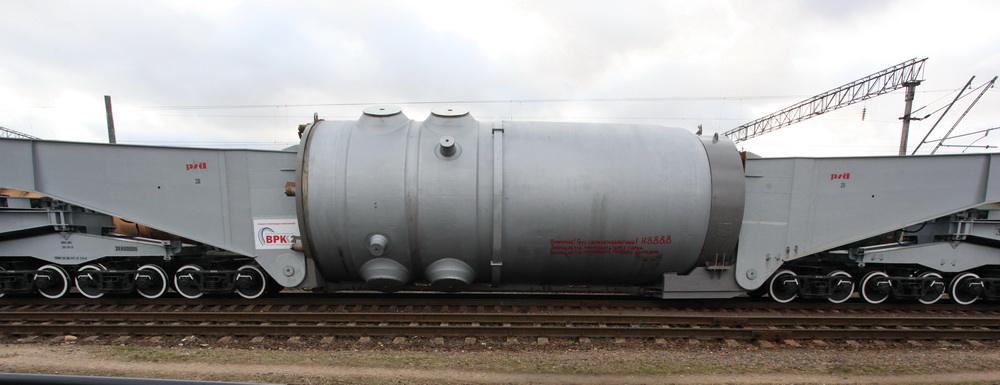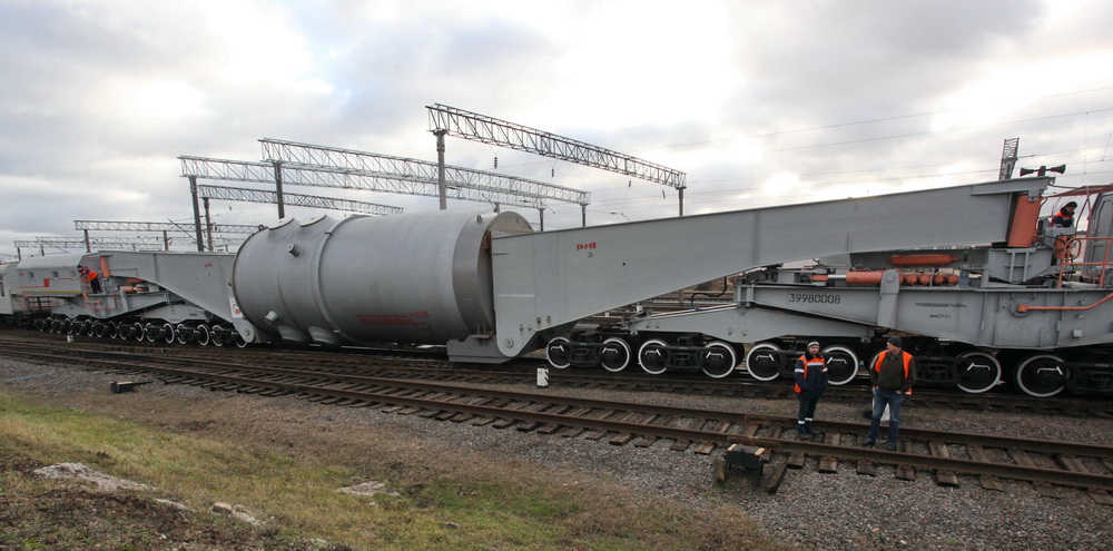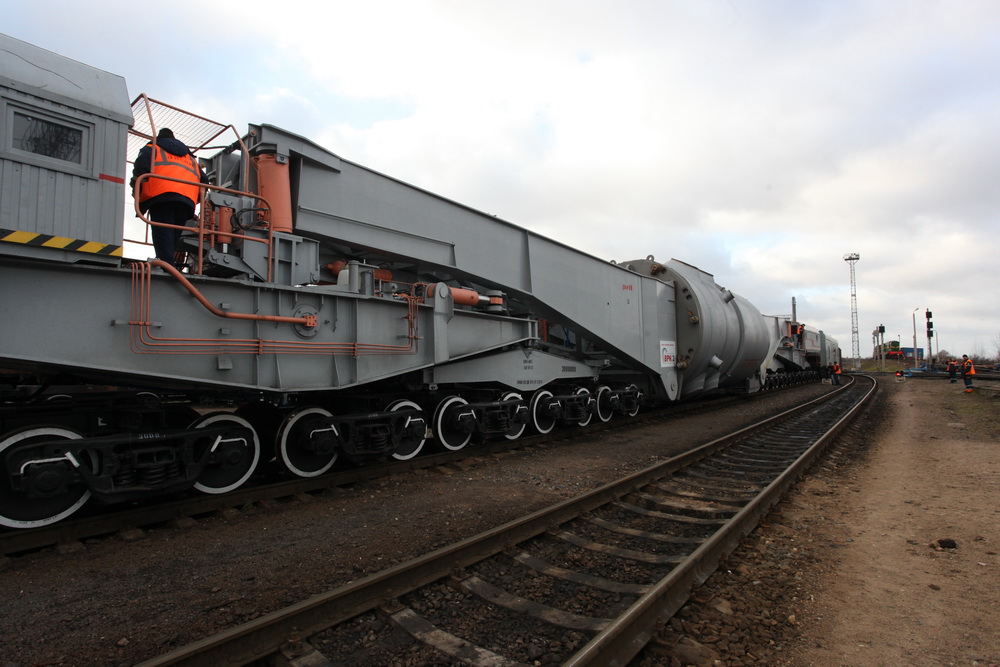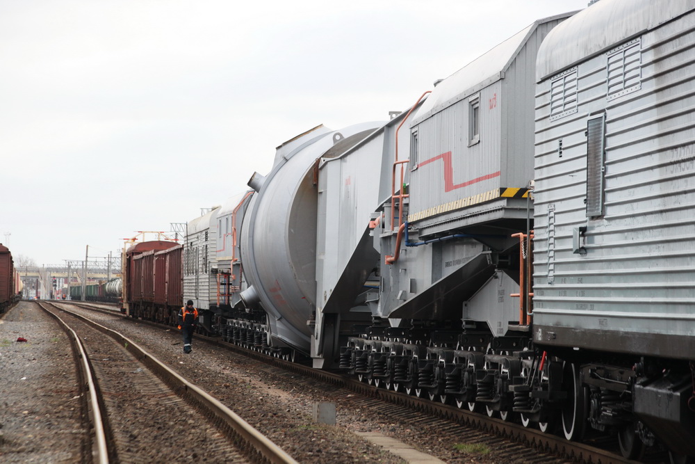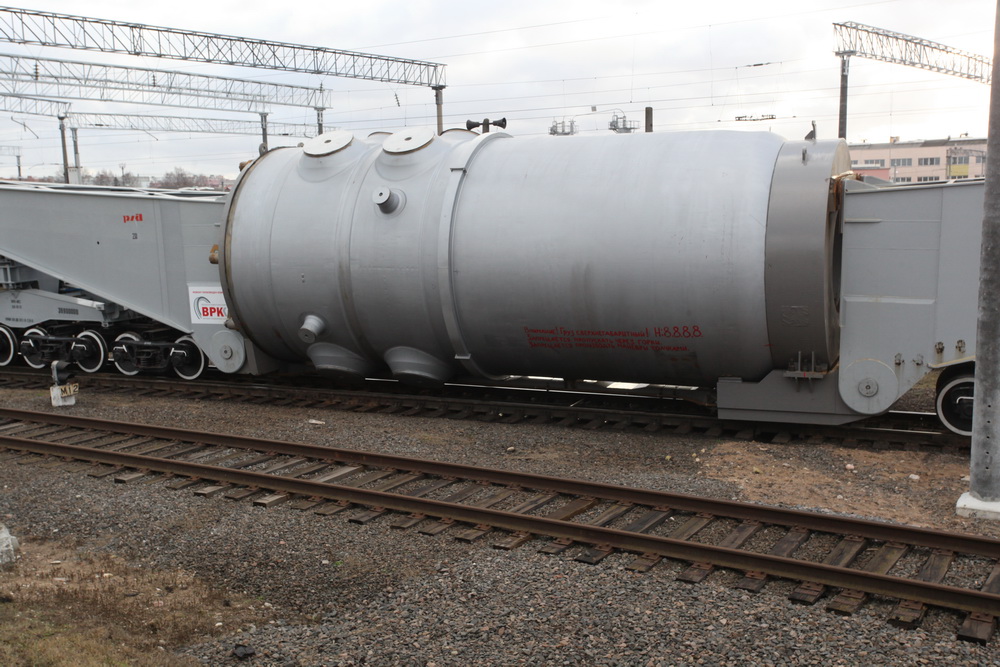 За локомотивом - платформа. Следом крытый грузовой вагон с вешками габаритов. Далее четыре полувагона, они нужны для того, чтобы в случае задевания вешками габаритов препятствия поезд мог остановиться, не повредив ценный груз. Далее жилой вагон мехсекции рефрижератора для сопровождающего персонала. В середине состава управляемая платформа вагона-транспортёра с корпусом реактора. С двух пультов управления у обоих концов платформы с тяжёлым грузом два оператора регулируют положение груза до полуметра право-влево и вверх-вниз относительно железнодорожного полотна для преодоления препятствия. Платформа с корпусом реактора имеет по 16 колёсных пар с каждой стороны. Эта платформа уже использовалась для транспортировки на Белорусскую АЭС частей парогенератора За грузовой платформой с корпусом реактора вновь следуют жилой вагон мехсекции, четыре полувагона, вагон с вешками и платформа. То есть, локомотив может цеплять состав с любого его конца, что облегчает маневрирование и позволяет соблюдать меры безопасности. По словам механика вагона-транспортёра Сергея Агулова, приходилось постоянно менять положение корпуса реактора, который вместе с креплением весит 418 тонн, чтобы не задеть объекты структуры железной дороги. "Возможно, мы повезём статор. Он самый тяжёлый, почти 500 тонн весит", - добавляет Сергей. Фоторепортаж Прибытие корпуса реактора, фото Василий Семашко.