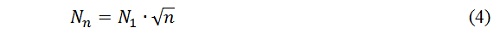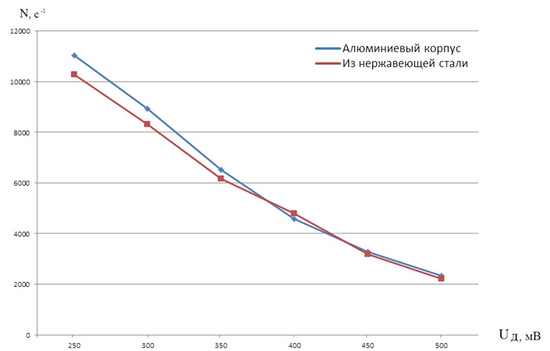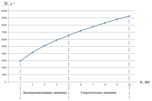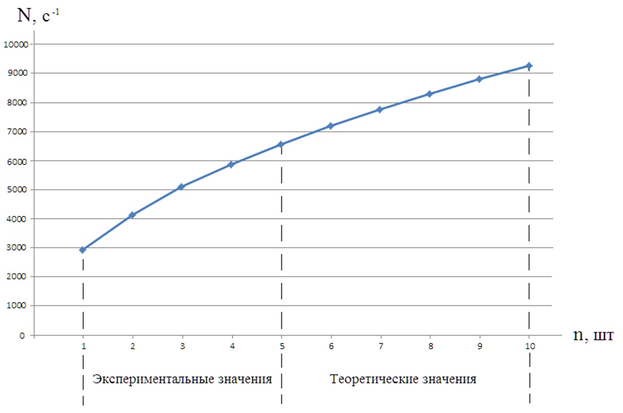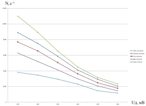 Взяв отношение каждой скорости счёта к скорости счёта одного счётчика, получим: ![]() Из приведённых расчётов видно следующее, что при количестве счётчиков n=2 скорость счёта по отношению к скорости счёта одного счётчика равна 1,4010, что приблизительно равно √n. Также и для других отношений: ![]() Тогда зависимость скорости счёта от количества счётчиков в блоке детектирования имеет следующий вид: ![]() где: Nn - скорость счёта n счётчиков; n - количество счётчиков в блоке детектирования; N1 - скорость счёта одного счётчика. Так как скорость счёта пропорциональна чувствительности для определённого уровня дискриминации, в нашем случае Uд=350 мВ, и равна ![]() Из полученной зависимости можно теоретически рассчитать, как изменится скорость счёта блока детектирования при увеличении счётчиков, например, до десяти. Результаты расчётов приведены в Таблице 2. Таблица 2.