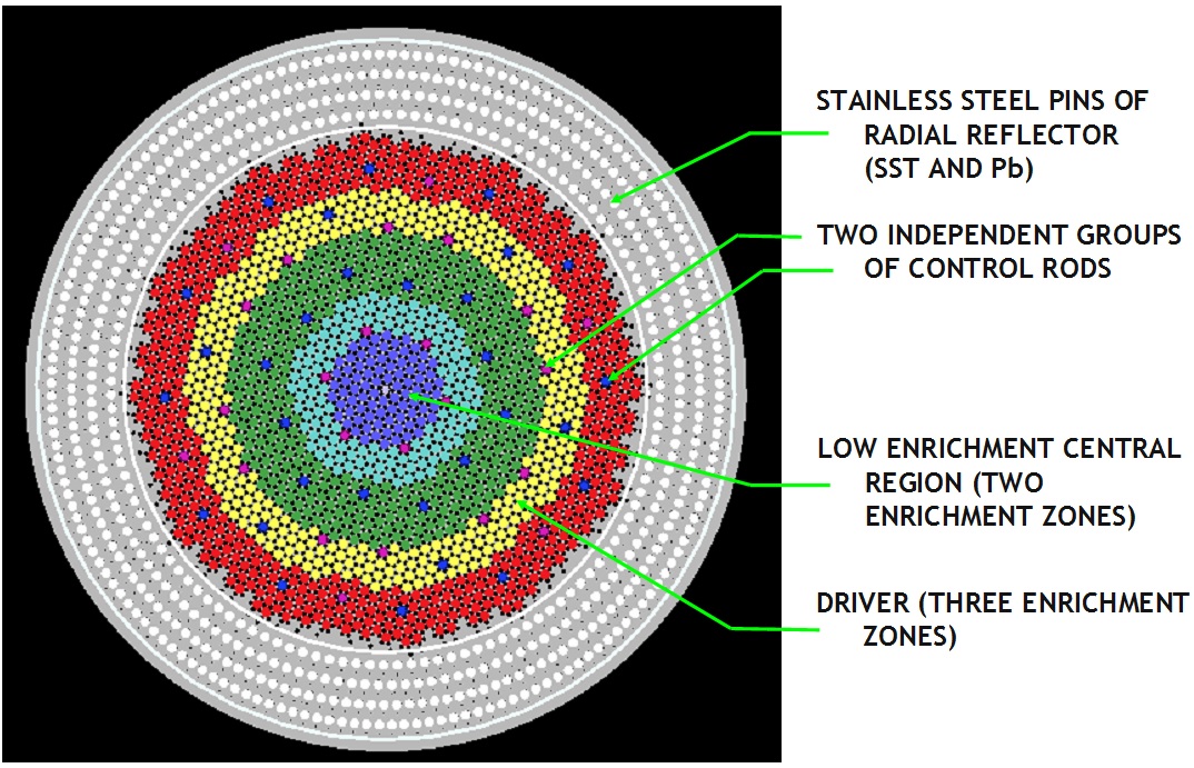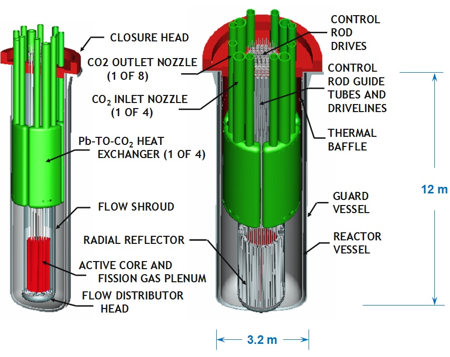 SSTAR - свинец из Америки Владимир Рычин, AtomInfo.Ru, ОПУБЛИКОВАНО 22.10.2016 Интерес к реакторам со свинцовым реакторам в прошлом году внезапно подогрела компания "Westinghouse", аннонсировавшая планы создать быстрый реактор V поколения со свинцовым теплоносителем. По тем данным, что есть в распоряжении электронного издания AtomInfo.Ru, компания по-прежнему не отказывается от сделанного выбора, хотя точно также по-прежнему не приоткрывает завесы таинственности хотя бы над обшей концепцией, не говоря уж об обликовом проекте свинцовой установки. Пока "Westinghouse" помалкивает, есть время вспомнить о другом американском свинцовом проекте - реакторе SSTAR, предложенном в Аргоннской национальной лаборатории. В 2007 году американские специалисты достаточно подробно рассказали о SSTAR во время работы в Обнинске "Быстрого клуба". С тех пор об этом проекте вспоминали нечасто, и судьба его непонятна. Реактор для международных потребителей Прежде чем говорить о SSTAR, стоит вспомнить, в какое время проект приобрёл известность. Великие державы одна за другой выдвигали инициативы со своим видением того, как следует реорганизовать мировую атомную энергетику. Естественно, свои предложения были и у США, их оформили в виде забытой сегодня инициативы GNEP. Одной из составляющей американского плана реорганизации было создание сети региональных центров, обменивающихся между собой делящимися и сырьевыми материалами, а также поставляющих странам-заказчикам топливо и забирающих у них ОЯТ. Архитектура системы с региональными центрами. ![]() Реактор SSTAR должен был существовать именно в такой системе. Причём - невиданная вещь! - американские разработчики предполагали свой быстрый реактор для международных потребителей, а не для развёртывания в региональных центрах. Реактор SSTAR Реактор SSTAR (Small Secure Transportable Autonomous Reactor) - модульный быстрый реактор мощностью 19,8 МВт(э), или 45 МВт(т). Блок с таким реактором в состоянии обслуживать город с населением до 25 тысяч человек. При разработке концептуального проекта SSTAR ставились следующие цели: - простота проекта и эксплуатации; - отсутствие промежуточного контура; - снятие номинальной мощности за счёт естественной циркуляции; - как можно меньший запас реактивности на выгорание; - автоматический режим слежения за нагрузкой во всём диапазоне мощности; - упор на пассивные средства защиты; - устойчивость к распространению (30 лет кампания, отсутствие запасов свежего топлива на площадке); - самодостаточность по делящимся материалам (КВ приблизительно равен единице); - простота транспортировки корпуса реактора; - повышенный к.п.д. за счёт использования цикла Брайтона на углекислом газе сверхкритических параметров. Основные параметры SSTAR приводятся ниже в таблице.