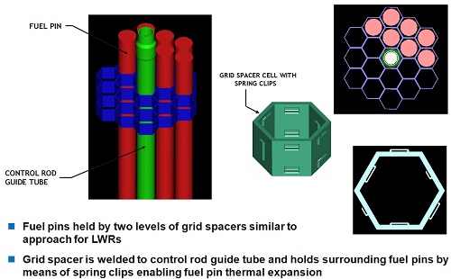 Реактор SSTAR. ![]() Активная зона реактора SSTAR. ![]() Топливо, оболочки, теплообменники Соединение твэлов в пучки в SSTAR обеспечивается двумя дистанционирующими решётками, наподобие того, как это делается в легководных реакторах. Решётки приварены к направляющей трубе и удерживают твэлы пружинами, допуская температурное расширение твэлов. Дистанционирующие решётки SSTAR. ![]() Использование сверхкритического цикла Брайтона побуждает работать с максимальной температурой оболочек твэлов порядка 650°C. Поэтому в SSTAR рассматривались перспективные материалы оболочек - в частности, феррито-мартенситная сталь с поверхностным слоем из стали, оптимизированной по содержанию кремния. Сталь с кремнием устойчива к коррозии при высоких температурах, однако имеет плохие характеристики по стабильности под облучением. Феррито-мартенситная сталь отвечает за прочность оболочки и за устойчивость к облучению. Теплообменник SSTAR схематично показан на рисунке ниже. Свинец движется сверху вниз, углекислый газ - снизу вверх. При температурах свыше 250°C эти два вещества химически не реагируют друг с другом. Теплообменник SSTAR. ![]() Слежение за нагрузкой производится автоматически, путём изменения теплоотвода от активной зоны, при этом мощность реактора устанавливается на новом уровне за счёт обратных связей по реактивности. Перемещения стержней СУЗ при этом не требуется. Изменение реактивности за 30-летнюю кампанию за счёт выгорания составляет менее 1 доллара. По ходу кампании будут требоваться незначительные изменения положения стержней СУЗ. Ключевые слова: Свинец, США, Статьи, Владимир Рычин Другие новости: В системе закупок атомной отрасли предлагается ввести аудит поставщиков до проведения торгов Мы не хотим, чтобы у нас возникали такие ситуации, как при закупке циркуляционных насосов для Нововоронежской АЭС - 82 месяца потрачено, а результата нет. Госдума приостановила соглашение с США по утилизации плутония 445 голосов "за", один воздержался. Документы на сооружение 5 и 6 блоков АЭС "Куданкулам" подпишут до конца года Будут подписаны генеральное рамочное соглашение и протокол о предоставлении кредита. |
