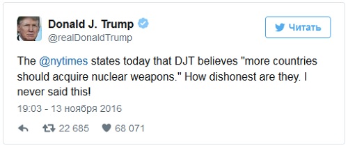 Трамп заявил, что Нью-Йорк Таймс исказила его позицию по ядерному оружию ТАСС, ОПУБЛИКОВАНО 14.11.2016 Избранный президент США Дональд Трамп считает, что американская газета "The New York Times" исказила в своих материалах его позицию по поводу ядерного оружия. Соответствующее сообщение он разместил в своем микроблоге в социальной сети Twitter. "The New York Times сегодня заявила, будто бы Дональд Трамп считает, что "больше государств должны получить ядерное оружие". Какие же они бесчестные. Я никогда этого не говорил", - написал республиканец. ![]() Во время предвыборной гонки он несколько раз теоретически допускал появление ядерного оружия у Японии и Южной Кореи. Трамп также сообщил в воскресенье, что "The New York Times" якобы разослала подписчикам письмо с извинениями по поводу "плохого освещения" касающихся его событий. При этом республиканец выразил сомнение в том, что издание как-то изменит свою информационную политику. По утверждению миллиардера, газета "теряет тысячи подписчиков из-за очень слабого и в значительной степени неверного освещения "феномена Трампа". По итогам президентских выборов кандидат от республиканской партии получил более 270 голосов выборщиков, что гарантировало ему победу. При этом в ходе избирательной кампании почти все ведущие американские СМИ отдавали явное предпочтение Хиллари Клинтон, которая также лидировала по результатам опросов общественного мнения до голосования. Ключевые слова: Нераспространение, США Другие новости: CNNC предлагает объединить АЭС и ГАЭС как альтернативу манёврам Пилотным может стать проект АЭС "Zhangzhou" и ГАЭС "Pingshuiyang". TVO получила первое решение арбитражного суда по делу об "Олкилуото-3" Документ трактует большинство фактов в пользу TVO. В мире статус действующего имеют 450 блоков, статус строящегося 60 блоков - PRIS Учтены пуск одного и начало строительства другого блоков в Пакистане. |