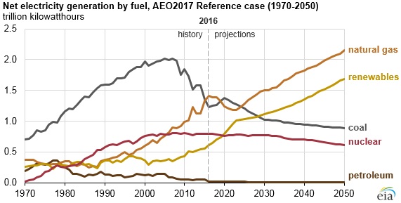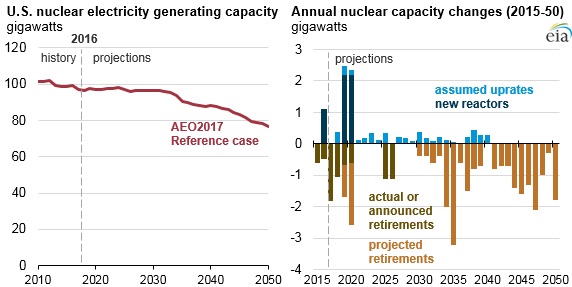 США - атом стареет AtomInfo.Ru, ОПУБЛИКОВАНО 15.05.2017 Атомный парк и доля атомной генерации в США будут сокращаться, так как ввод новых мощностей не замещает в полной мере выводимые блоки. Об этом говорится в отчёте агентства энергетической информации (EIA) при министерстве энергетики США. Прогнозируемое снижение На долю атомных станций в настоящее время в США приходится порядка 20% от общей энерговыработки. Однако АЭС стареют. По оценкам EIA, до 25% атомных мощностей, по которым пока не было сделано объявлений о сроках вывода, будут в действительности закрыты в период до 2050 года. Атомный парк США (слева) и динамика его изменения до 2050 года. ![]() Почти все атомные энергоблоки в США были сданы в коммерческую эксплуатацию в 70-80-ые годы. Исходно им выдавались лицензии на 40 лет службы, впоследствии почти все блоки получили продление на 20 лет. Для продолжения работы после 60 лет им вновь придётся пройти через процедуру продления. Оценки ввода новых атомных мощностей в США ещё более пессимистичные. Базовый вариант прогноза исходит из предположения, что до 2050 года будут пущены только строящиеся сейчас четыре блока с AP-1000. Кроме того, определённое приращение атомного парка произойдёт за счёт форсирования мощности ряда действующих энергоблоков. За исключением остановов на ППР, атомные блоки работают в режиме несения базовой нагрузки, 24 часа в сутки на постоянной мощности. Соответственно, коэффициент использования установленной мощности у АЭС намного выше, чем у других типов электростанций. Постепенный вывод стареющих атомных блоков и замещение их станциями на газе или возобновляемых источниках приведёт к снижению доли атомной генерации. По базовому варианту прогноза, к 2050 году она снизится с 20% до 11%. Генерация в США, триллионов кВт×ч. ![]() Пуски и закрытия Базовый прогноз EIA предполагает, что добавка к атомному парку США до 2050 года составит 9,1 ГВт(э). Прогноз строится на предположении, что текущие законодательство и политика в стране не претерпят изменений. Из них, 4,4 ГВт(э) появятся благодаря вводу четырёх строящихся блоков с AP-1000 - по два блока на АЭС "Vogtle" и "V.C.Summer". Не исключено, однако, что блоки будут пущены не все или не будут пущены вовсе, так как стартовавшая процедура управляемого банкротства "Westinghouse" поставила судьбу данных проектов под сомнение. Оставшиеся 4,7 ГВт(э) появятся благодаря форсированию мощности действующих энергоблоков. В отчёте отдельно указывается, что этот ресурс будет полностью исчерпан к 2040 году - после этой даты новых форсирований уже не будет. Принятые в базовом прогнозе данные по выводу блоков более чем в три раза перекрывают прирост суммарной мощности. Согласно прогнозу, до 2050 года будет выведено 29,9 ГВт(э) атомных блоков. По некоторым из них уже есть соответствующие планы и намерения эксплуатирующих организаций. Объявленные пуски и закрытия блоков. ![]()