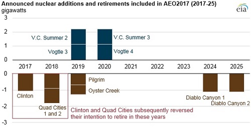 В то же время, в графике не учтены сделанные компанией "Entergy" заявления о планах досрочно закрыть АЭС "Palisades" (2018 год) и два блока АЭС "Indian Point" (ориентировочно в 2020 году). Существенным моментом является неопределённость по объёмам ресурсов (включая финансовые), которые потребуются для возможного продления действующих блоков до 80 лет. "Капитальные вложения, требующиеся для продления сроков эксплуатации блоков более 60 лет, в настоящее время неизвестны. Они могут в значительной степени варьироваться для различных блоков", - отмечается в отчёте EIA. "Другим неопределённым фактором является наличие у эксплуатирующих организаций интереса к продлению лицензий (сверх 60 лет) и готовность комиссии по ядерному регулированию (NRC) продлевать лицензии". Авторы отчёта напоминают также, что значительный вес при принятии решений о закрытии атомных станций будет играть сравнение с другими энергоисточниками, в особенности, с природным газом. Другие новости: Регуляторы Японии отложили рассмотрение заявки о повторном пуске JOYO В работе на пониженной мощности отказано. Инцидент 9 мая 2017 года. Ростовская АЭС: на пусковом энергоблоке №4 специалисты начали сборку реактора В течение 25 дней в реактор будут установлены все внутрикорпусные устройства. |