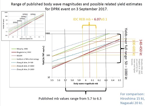 CTBTO обновила данные о событии в КНДР AtomInfo.Ru, ОПУБЛИКОВАНО 10.09.2017 Организация Договора о всеобъемлющем запрещении ядерных испытаний (CTBTO) распространила новые оценки необычного сейсмического события в КНДР 3 сентября 2017 года. Исходно магнитуда землетрясения была оценена как 5,8, однако впоследствии оценка была пересмотрена до 6,1. Землетрясение произошло в районе ядерного полигона КНДР. Анализ имеющихся данных показывает, что землетрясение имело искусственный характер, то есть, произошло в результате взрыва. Однако подтвердить ядерный характер взрыва станет возможным только после обнаружения вышедших в атмосферу радиоактивных газов. Второе необычное сейсмическое событие, зафиксированное спустя 8,5 минут после первого, не было вызвано взрывом. Организация также опубликовала возможные оценки мощности взрыва в зависимости от магнитуды. Щёлкните левой клавишей мыши для просмотра Ключевые слова: ЯОК, Азия, КНДР Другие новости: "Clinch River" - сокращение EPZ TVA предлагает NRC отказаться от 10-мильной зоны для будущей АСММ "Clinch River". Заявление МИД Российской Федерации Продолжение такой линии чревато серьёзными последствиями для самой КНДР. Синоптик: последствия ядерного испытания в КНДР не угрожают Приморью Радиационный фон в норме. |
