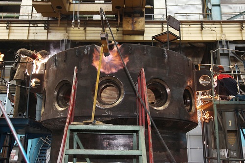 Завершена уникальная операция сварки элементов корпуса реакторной установки РИТМ-200 для ледокола нового поколения Урал Медиа-центр АО Атомэнергомаш, ОПУБЛИКОВАНО 22.03.2018 В ПАО "Машиностроительный завод "ЗиО-Подольск" (входит в машиностроительный дивизион Росатома - Атомэнергомаш) завершён процесс приварки паровых патрубков к корпусу второго реактора силовой установки "РИТМ-200" для второго серийного ледокола "Урал". ПРОДОЛЖЕНИЕ ПОСЛЕ ФОТО Фото Атомэнергомаш ![]() При проведении данной операции использовался один из самых сложных способов сварки - в неповоротном положении при постоянном подогреве металла в зоне сборки. Сварка деталей в неповоротном положении применяется в особых случаях, когда изделие невозможно кантовать, а доступ к шву затруднён. Сварные соединения выполнялись в нескольких пространственных положениях одновременно при подогреве металла в зоне сборки выше 200 градусов во избежание получения трещин в сварных соединениях. Всего к полукорпусу реактора было приварено десять патрубков различного назначения: для отбора пара, для забора и возврата теплоносителя на очистку и расхолаживание, а также для подсоединения системы компенсации давления теплоносителя и системы подпитки и проливки. Последующая термообработка изделия длилась более суток при температуре 650 градусов. После термической и механической обработки полукорпуса реактора специалисты центральной лаборатории неразрушающих методов провели контроль качества в рентгеновской камере. Результаты показали, что сварные соединения полностью соответствуют максимально жёсткому стандарту качества. В 2016-2017 годах с производственной площадки ЗиО-Подольска были отгружены заказчику и установлены на судне реакторные установки "РИТМ-200" для головного ледокола нового поколения "Арктика" и первого серийного атомохода "Сибирь". Предприятия АО "Атомэнергомаш" обеспечивают полную производственную цепочку создания силовой установки "РИТМ-200" - от проектирования и производства заготовок до изготовления и монтажа оборудования. Проектировщиком и комплектным поставщиком выступает входящее в холдинг АО "ОКБМ Африкантов". Ключевые слова: Атомоходы, Атомное машиностроение, Россия, Пресс-релизы Другие новости: В мире статус действующего имеют 450 блоков, статус строящегося 55 блоков - PRIS Учтён энергопуск блока №1 Ленинградской АЭС-2. Белоярская АЭС: энергоблок №4 с реактором БН-800 работает на номинальном уровне мощности Блок вышел на номинал 13 марта. Ростовская АЭС: на энергоблоке №4 произведён подъём мощности до 75% Ввод энергоблока №4 в промышленную эксплуатацию запланирован на 2018 год. |