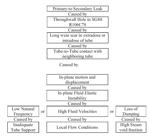 Простая и легко устранимая вычислительная ошибка была найдена спустя примерно две недели после появления результатов расчётов по другому коду. Если бы японские конструкторы выполнили такую проверку на этапе проектирования, то всей истории, закончившейся досрочным закрытием двух блоков, возможно, просто не произошло бы. В реальной жизни, а не во вселенной What If, такие расчёты выполнил консультант MHI Пол Ланфорд. Он сразу предположил, что японские конструктора "забывают умножить скорости пара на какой-то коэффициент", а от этой гипотезы до проверки корректности задания геометрии - один шаг. Как мы уже рассказывали, японцы почти пять месяцев (!!) объясняли, почему верны именно их расчёты. Консультант убедился в бессмысленности своих усилий, тема о его сомнениях ушла в архивы, чтобы вернуться спустя шесть лет, но уже после инцидента. "После обнаружения износа типа "труба об трубу" (tube-to-tube wear, TTW) в ПГЗ, корпорация MHI провела оценку проекта ПГЗ с использованием кода ATHOS". "MHI подтвердила, что для условий со всеми активными опорами максимальное значение коэффициента SR, рассчитанное по ATHOS, меньше чем 0,75, что в свою очередь меньше требуемого значения 1,0 в стандарте "ASME Section III Appendix N-1330". "MHI пришла к заключению о том, что проект антивибрационных решёток (AVB) обеспечивает предотвращение вибраций типа FEI при смещениях вне плоскости. MHI также подтверлила, что коэффициенты SR в области, в которой наблюдался износ трубок типа TTW, меньще 1,0 даже при условии одной неактивной опоры". Иными словами, даже с исправленными расчётами теплогидравлическая стабильность парогенераторов вышла гарантированной? Да здравствует консерватизм при проектировании? К сожалению для японцев, всё оказалось не так просто. Цитируем японский отчёт от 13 апреля дальше. "Если бы MHI использовала (при проектировании) такой теплогидравлический код, как ATHOS, то предсказанные теплогидравлические условия (в парогенераторах) были бы более сложными, чем предсказанные по коду FIT-III". "Если бы MHI определила (при проектировании), что предсказанные теплогидравлические условия должны рассматриваться на основе... (менее благоприятного) анализа, то проект ПГЗ мог бы подвергнуться модификациям". "Предполагаемым изменением (в этом случае) стала бы добавка дополнительных решёток AVB плоского типа". Но и это изменение конструкции, признавали в MHI, не спасло бы ситуацию. Плоские антивибрационные решётки не смогли бы предотвратить появление вибраций типа FEI при смещениях в плоскости, а также случайных вибраций при высоких паросодержаниях. Изменившиеся отношения Ошибка в вычислениях была найдена и признана, но она не могла полностью объяснить случившееся. Поиски коренных причин продолжились. 20 апреля 2012 года SCE представила на одном из рабочих совещаний схему, которую она назвала "лестницей коренных причин". ![]() Тучи над MHI продолжали сгущаться. Консультант японской корпорации Роберт Уилсон в одном из служебных писем напомнил, что MHI взялась за задачу, подобных по сложности которых она ранее никогда не решала. Действительно, все парогенераторы, которые проектировала и изготавливала MHI до заказа для "San Onofre", были в два-три раза меньше по мощности. Следовательно, намекал консультант, при расследовании американского инцидента могут всплыть и другие проблемы или ошибки, о которых японцы пока не подозревают из-з