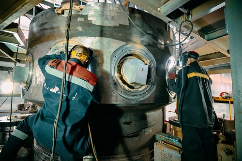 ЗиО-Подольск перешёл к заключительному этапу изготовления первого реактора РУ РИТМ-200 для ледокола Урал Медиа-центр АО Атомэнергомаш, ОПУБЛИКОВАНО 30.08.2018 В ПАО "ЗиО-Подольск" (входит в машиностроительный дивизион Росатома - Атомэнергомаш) завершилась сложнейшая операция по сборке интегрированного корпуса первого реактора силовой установки "РИТМ-200" для третьего ледокола проекта 22220 "Урал". Закончились работы по приварке 12 кассет парогенераторов (ПГ) в зоне фланца. Таким образом, изготовление первого реактора вышло на финишную прямую. ПРОДОЛЖЕНИЕ ПОСЛЕ ФОТО Фото Атомэнергомаш. ![]() Кассеты ПГ изготовило АО "ОКБМ Африкантова" (также входит в машиностроительный дивизион Росатома - Атомэнергомаш). Если ранее парогенераторы находились вне реактора, то теперь располагаются непосредственно в нём. Именно в этом и заключается уникальность реакторной установки "РИТМ-200", которая имеет максимально компактную и энергоэффективную интегральную компоновку оборудования. В процессе сборки специалистам ПАО "ЗиО-Подольск" удалось совместить кассеты ПГ (каждая весом почти полторы тонны) с ранее прошедшими механическую обработку посадочными местами ПГ с допуском в сотые доли миллиметра. Кассеты ПГ расположены внутри корпуса и предназначены для генерирования пара необходимых параметров. Монтаж кассет производился через главный разъём корпуса с использованием специальной оснастки, разработанной специалистами ЗиО-Подольска. Коллектор кассеты ПГ установлен в боковое гнездо корпуса и приварен силовым сварным швом. Сварные соединения велись в неповоротном положении на глубине 120 мм в щелевом пространстве 50 мм. Сейчас корпус первого реактора готовят к гидравлическим испытаниям, затем пройдёт контрольная сборка с внутрикорпусными устройствами и крышкой. Ранее ПАО "ЗиО-Подольск" изготовил силовые установки "РИТМ-200" для ледоколов нового поколения "Арктика" и "Сибирь". Предприятия АО "Атомэнергомаш" обеспечивают полную производственную цепочку создания атомного двигателя "РИТМ-200" - от проектирования и производства заготовок до изготовления и монтажа оборудования. Проектировщиком и комплектным поставщиком выступает входящее в холдинг АО "ОКБМ Африкантов". Фото Атомэнергомаш. ![]() Ключевые слова: Атомоходы, Россия, Пресс-релизы Другие новости: На "Атоммаше" провели одну из ключевых сварочных операций на МБИР Сварены корпус корзины МБИР и камера высокого давления. В мире статус действующего имеют 455 блоков, статус строящегося 55 блоков - PRIS Учтён энергопуск "Sanmen-2". На "Тяньване-4" началась загрузка топлива Первую кассету загрузили 25 августа в 19:20 по местному времени. |