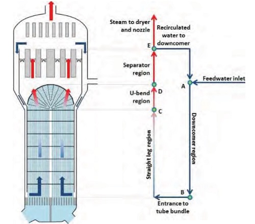 На своём пути через опускной участок поток воды проходит через ряд сужений. В японском проекте парогенератора таких сужений было восемь - по одному на каждую опорную доску (tube support plate, TSP), а также одно сужение в нижней части опускного участка. На каждом из сужений происходит потеря давления.