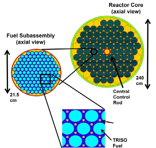 Реактор Holos для армии США AtomInfo.Ru, ОПУБЛИКОВАНО 10.03.2019 Интерес армии США к малым реакторам в последние годы значительно возрос. Возможные выгоды от их применения проанализировали авторы статьи в журнале "Journal of Defense Management" (том 8, вып.1, 2018) Кеннет Аллен и др., представляющие военную академию США (Нью-Йорк). Реактор "Holos" В своей статье американские авторы рассмотрели проект микромодульного реактора "Holos Highly Integrated Micro Modular Reactor" ("Holos" HI-MMR), разработанный компанией "Filippone and Associates LLC". Активная зона реактора "Holos" состоит из длинного узкого псевдоцилиндрического массива тепловыделяющих сборок, расставленных вокруг центрального канала для органов управления. Число сборок в активной зоне варьируется в зависимости от мощности реактора, для целей статьи выбрана компановка из 78 кассет. Каждая ТВС состоит из массива топливных каналов и каналов теплоносителя, окружённого стальной оболочкой. Топливо - шаровое, TRISO, плотность упаковки 0,4. Обогащение урана для целей статьи было выбрано равным 10%. В качестве теплоносителя авторы статьи для своего моделирования взяли чистый гелий. На рисунке ниже гелий показан жёлтым цветом, а корпус реактора, выполненный из оксида бериллия и играющий роль отражателя - зелёным. Щёлкните левой клавишей мыши для просмотра ![]() Нейтронно-физические параметры С помощью широко известного монте-карловского кода MCNP6.1, авторы провели расчёты некоторых нейтронно-физических параметров реактора "Holos" (с учётом принятых допущений). Для свежего топлива в горячем состоянии (900 градусов Кельвина) значение kэфф составило 1,05810±0,00166. Это достаточно большой запас реактивности, и для его компенсации в проекте должны быть предусмотрены соответствующие средства. В холодном состоянии (при комнатной температуре) запас реактивности ещё больший, значение kэфф достигает 1,094. Температурный коэффициент реактивности, как и следовало ожидать, отрицательный и равен -0,0000338±0,000005 K-1. Интересное поведение реактивность демонстрирует при выгорании (расчёты велись для мощности 30 МВт(т)). Во-первых, исходного запаса реактивности хватает на 35-40 лет работы. Однако следует учесть, что этот результат был получен для идеализированной модели, в которой не учитывался паразитный захват в органах регулирования, компенсирующих превышение реактивности над нулём. Расчёты по моделям, более приближенным к реальным условиям работы, дают значение кампании порядка 13 лет. Во-вторых, в первые 100 суток работы реактора реактивность не падала, а слегка возрастала. Это связано с более высоким, по сравнению с легководными аппаратами, значением коэффициента воспроизводства в реакторе "Holos". Щёлкните левой клавишей мыши для просмотра ![]() Сравнение для Баграма Во второй части статьи авторы проанализировали возможности применения малых реакторов для баз передового развёртывания (forward operating base), использовав для сравнения данные по базе "Баграм" в Афганистане. Потребности базы "Баграм" в электроэнергии составляют 56 МВт(э). Их обеспечивают, в общей сложности, 15 генераторов. Авторы статьи предложили рассмотреть следующий вариант - четыре реактора "Holos" мощностью 13,5 МВт(э) каждый и 10 генераторов мощностью по 1 МВт(э) каждый. Кампания реакторов составляет в этом сравнительном расчёте 13 лет. Сравниваемые варианты для базы "Баграм" ![]() В следующей таблице рассмотрены возможные варианты доста